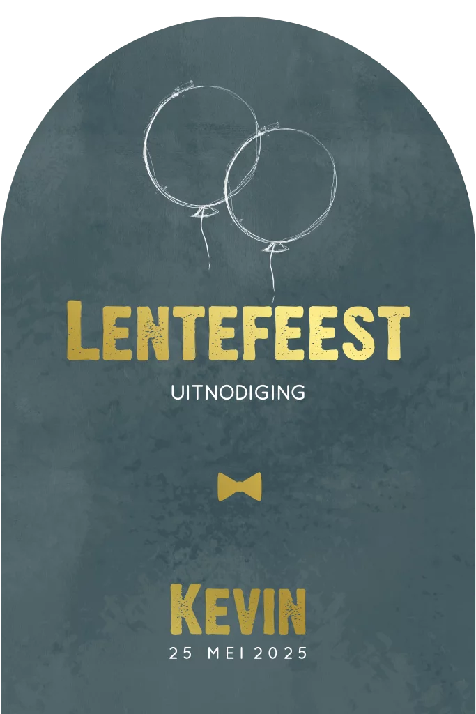 Heb je een lentefeest voor je zoon in het vooruitzicht? Stuur dan originele uitnodigingen naar je gasten toe met deze bijzondere uitnodigingskaart in boogvorm met goudfolie bedrukking. De kaart is donkerblauw van kleur en heeft een mooie versiering van ballonnen en een strikje. Pas de kaart geheel naar wens aan en bestel een proefdruk, zodat je zeker weet dat de kaart precies is zoals jij wilt. Verstuur de kaart in stijl in een mooie envelop naar keuze en plak deze dicht met een sluitzegel.