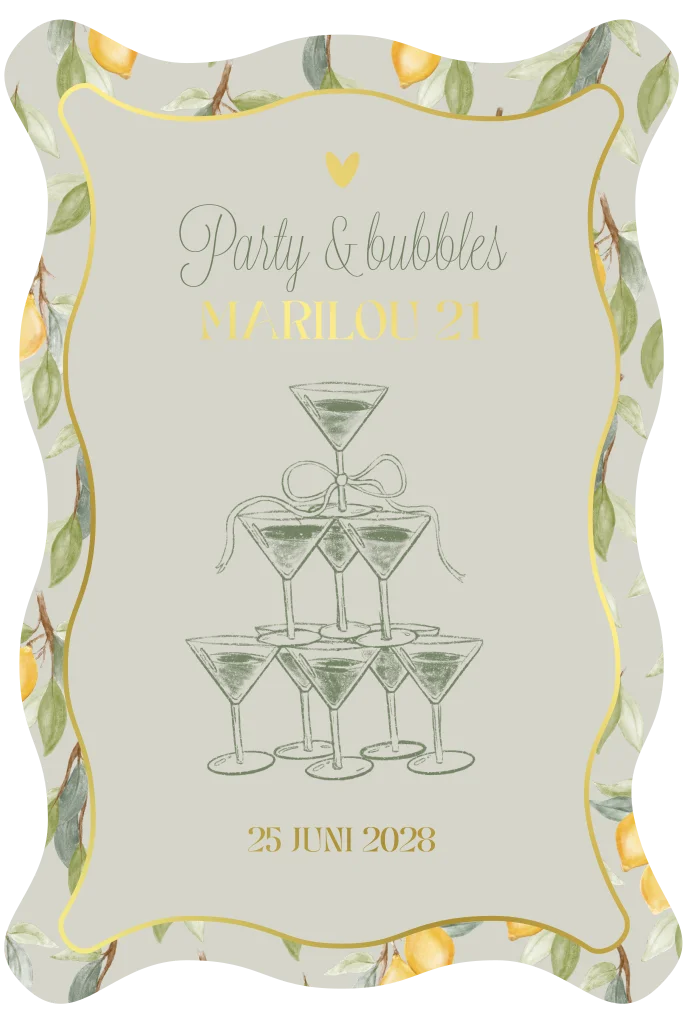 Vier jouw 21e verjaardag in stijl met deze elegante uitnodiging met zomerse citroenen en een chique toren van champagneglazen. De unieke golfrand en gouden details geven de kaart een luxe uitstraling, perfect voor een avond vol bubbels, gezelligheid en lekker eten.