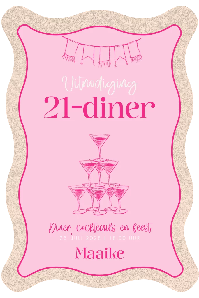 Uitnodiging 21-diner met Ibiza look – roze golfrand en cocktails