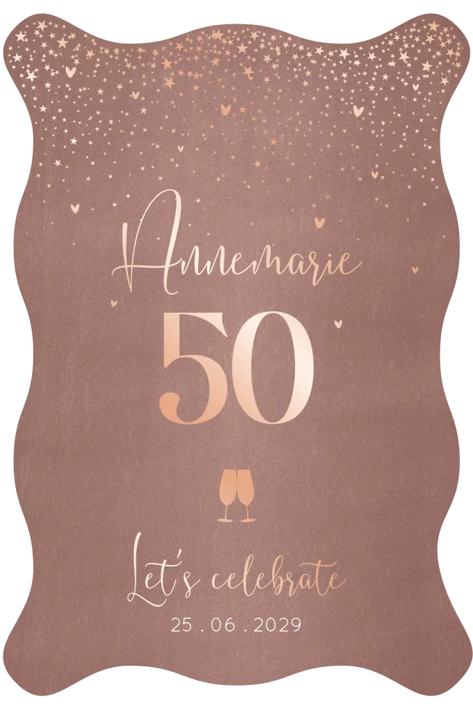 Nodig vrienden en familie uit met een stijlvolle uitnodiging voor jouw mijlpaal verjaardag. De luxe roze-bruine achtergrond met sierlijke letters komt extra mooi tot zijn recht door de bijzondere golfrand en de feestelijke sterretjes en hartjes in rosé-goudfolie.