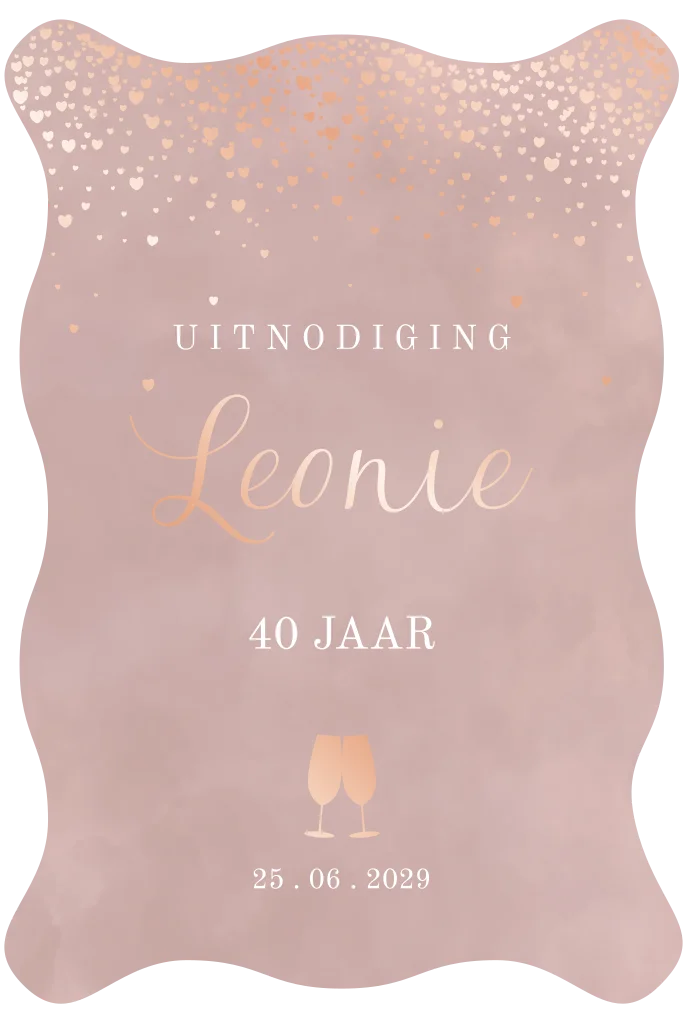 Nodig familie en vrienden in stijl uit met deze elegante uitnodiging! De roze achtergrond en de bijzondere golfrand worden prachtig gecombineerd met goudfolie hartjes en jouw eigen naam in sierlijk lettertype.