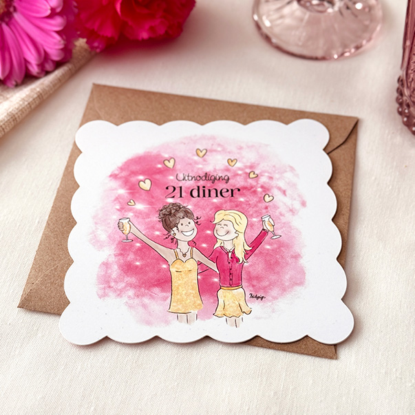 Vier je 21ste verjaardag in stijl met deze vrolijke en unieke uitnodiging! Deze kaart heeft een bijzondere kronkelige vorm en een knalroze waterverf kleur, met daarop een tekening van twee jonge vrouwen die feestelijk proosten met champagne. Het perfecte design voor een gezellige en feestelijke uitnodiging voor jouw diner of verjaardagsfeest! Pas de tekst eenvoudig aan in de online editor en maak de uitnodiging helemaal persoonlijk. Bestel een proefdruk om de kaart in het echt te zien voordat je hem verstuurt. Laat je gasten weten dat ze een geweldige tijd kunnen verwachten!