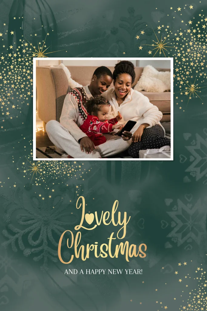 Chique foto kerstkaart – groene achtergrond met goudkleurige sterren