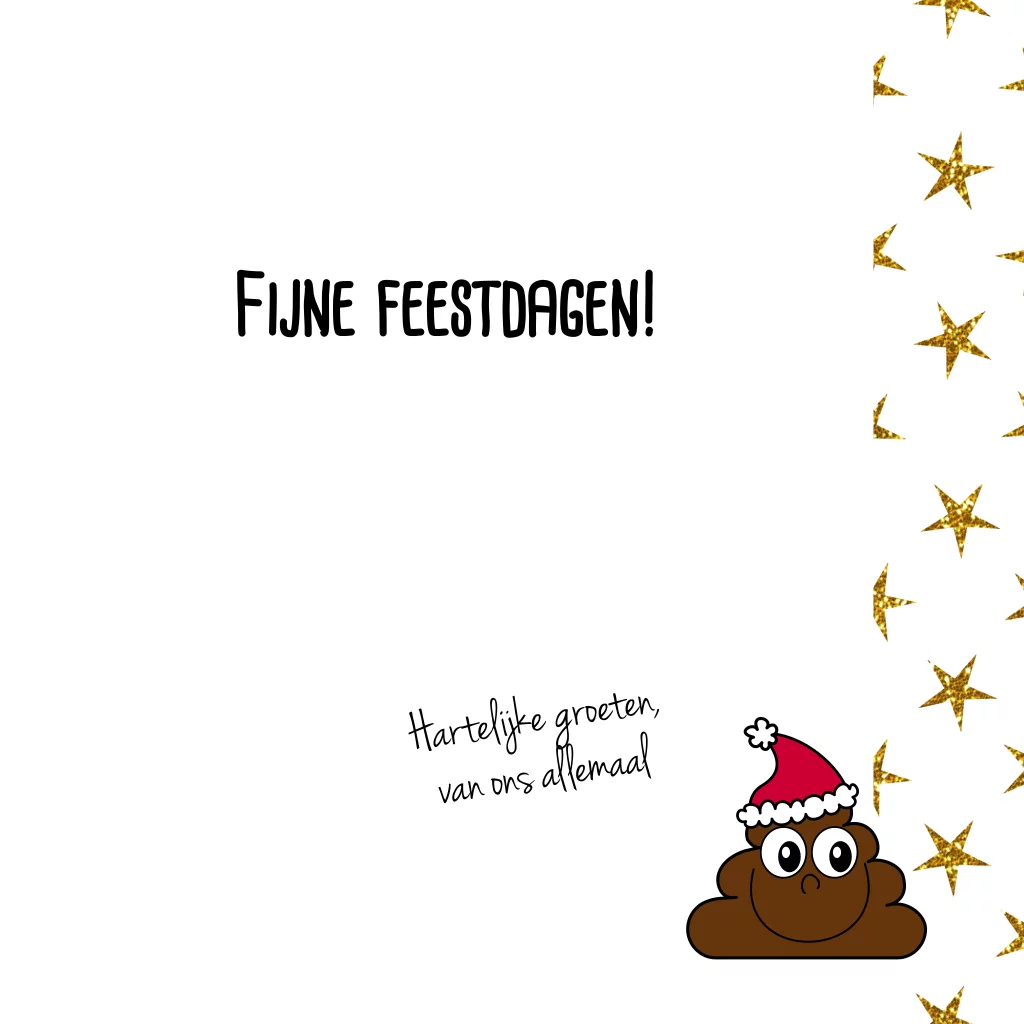 Grappige witte kerstkaart met glitter sterren en een emoji drol met een kerstmuts. Joepie de poepie Kerst! Geen echte gouden glitters, deze worden gedrukt ;-)