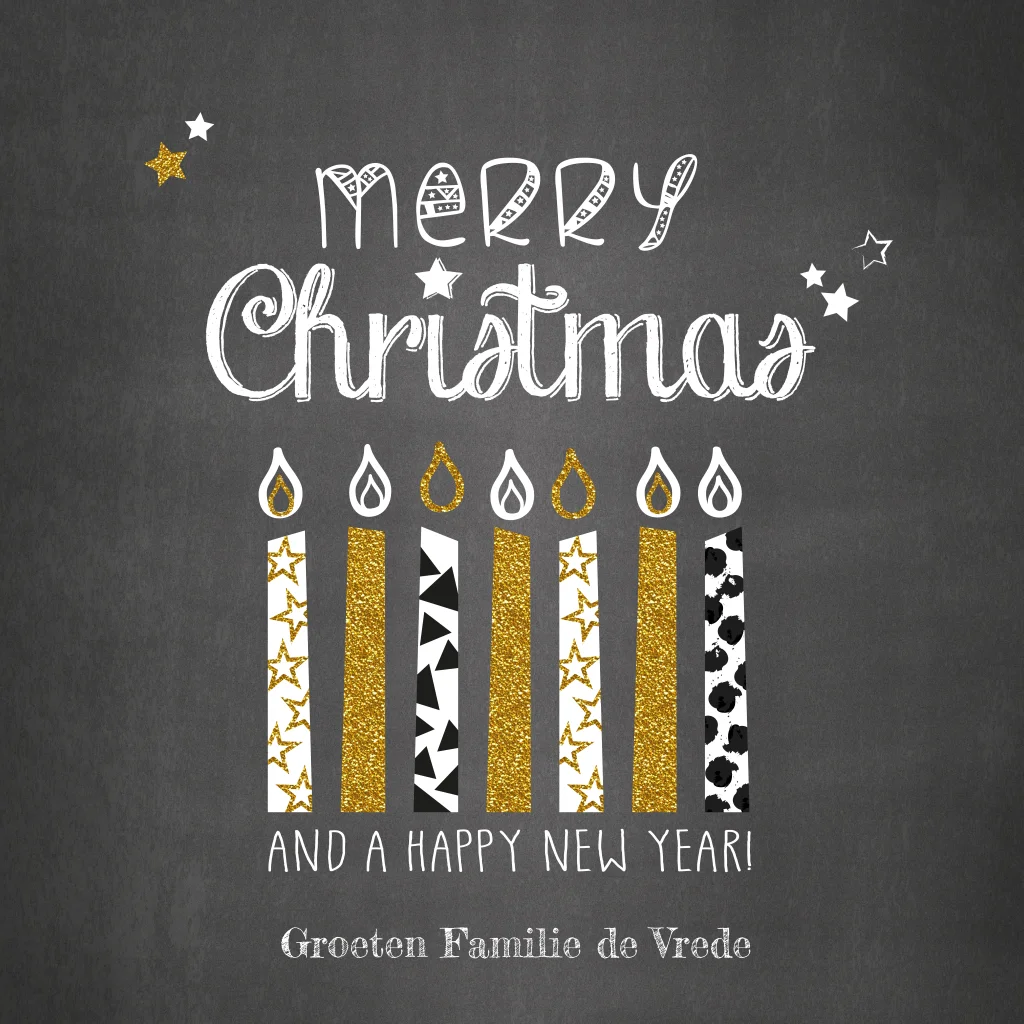 Hippe kerstkaart handlettering met krijtbord look en een illustratie van kaarsjes. De gouden glitter elementen zijn geen goudfolie of echt glitters.