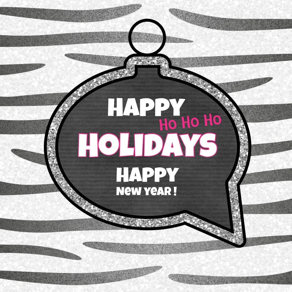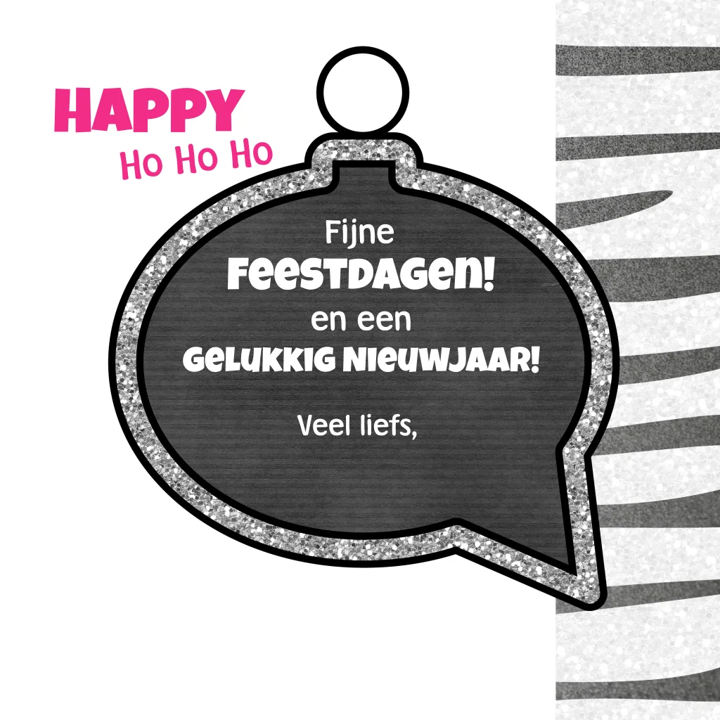 Trendy kerstkaart met een zilverkleurig zebraprintje en een grote kerstbal in de vorm van een tekstwolkje.