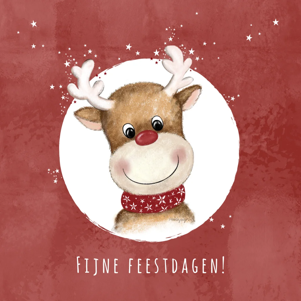 Grappige rode kerstkaart met een tekening van een fluffy rendier met een rode neus en vele sterretjes. Pas de kaart naar wens aan en maak er jouw unieke kerstkaart van met een persoonlijke kerstwens.
