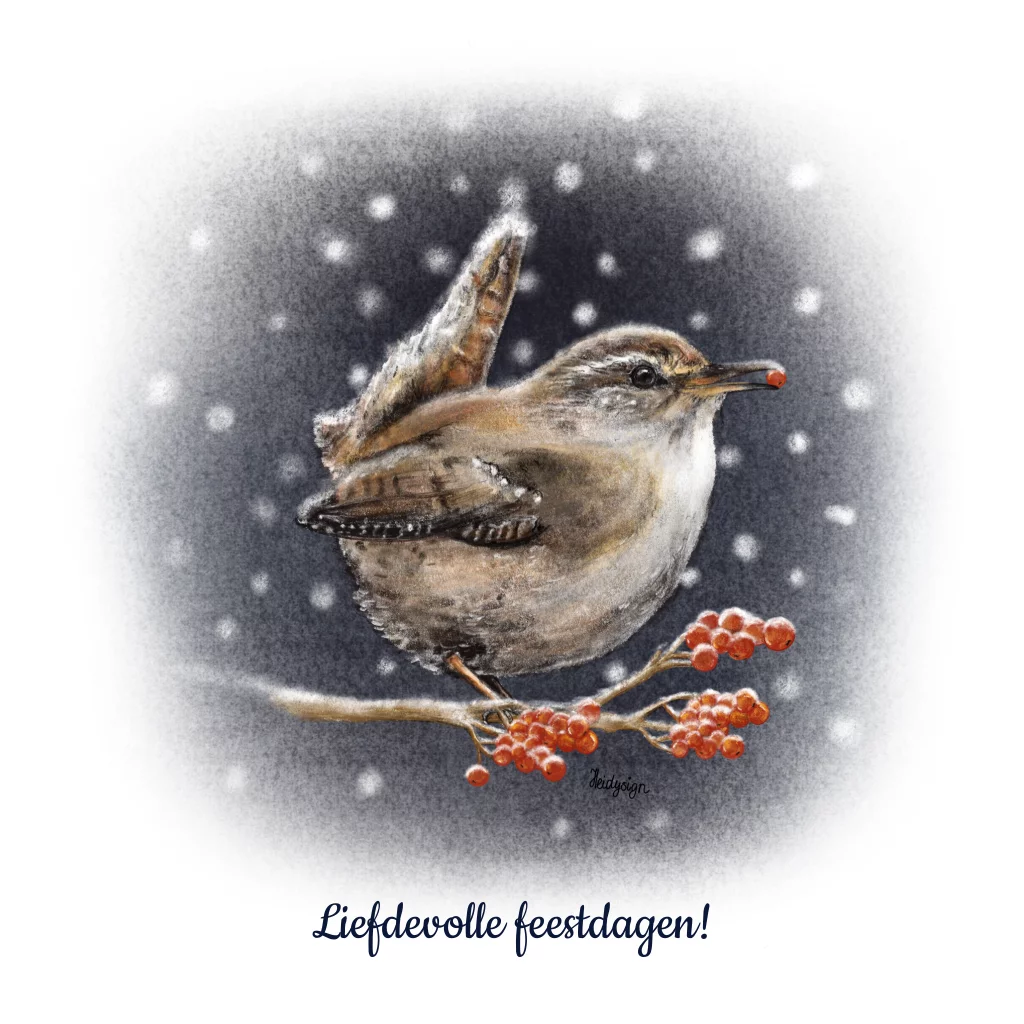 Kerstkaart – Winterkoninkje met besje in de sneeuw