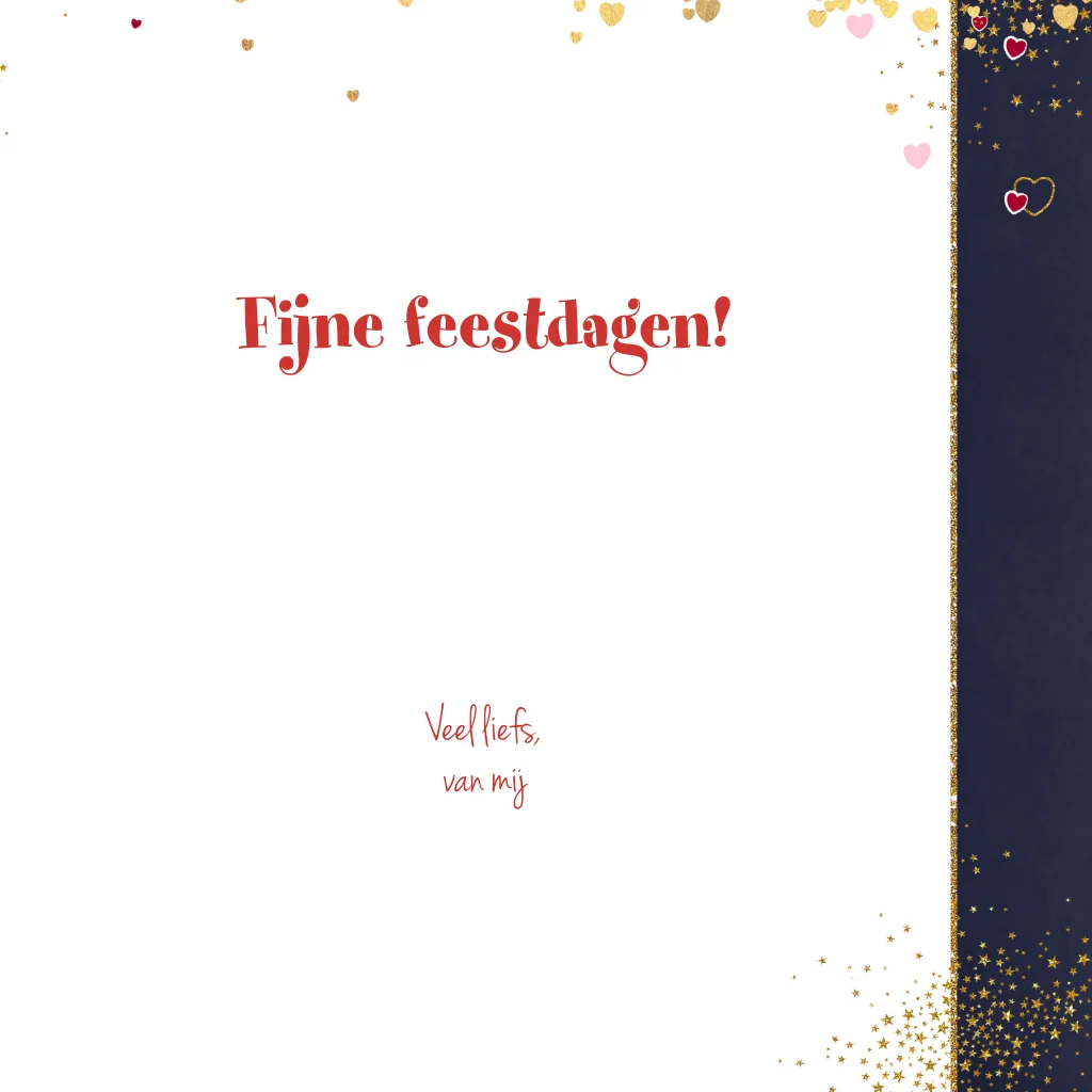 Sfeervolle blauwe kerstkaart met een illustratie van een schattige pinguïn met een kerstmuts en vele goudkleurige hartjes en sterretjes. (Goudkleur wordt nagebootst, dit is geen goudfolie)
