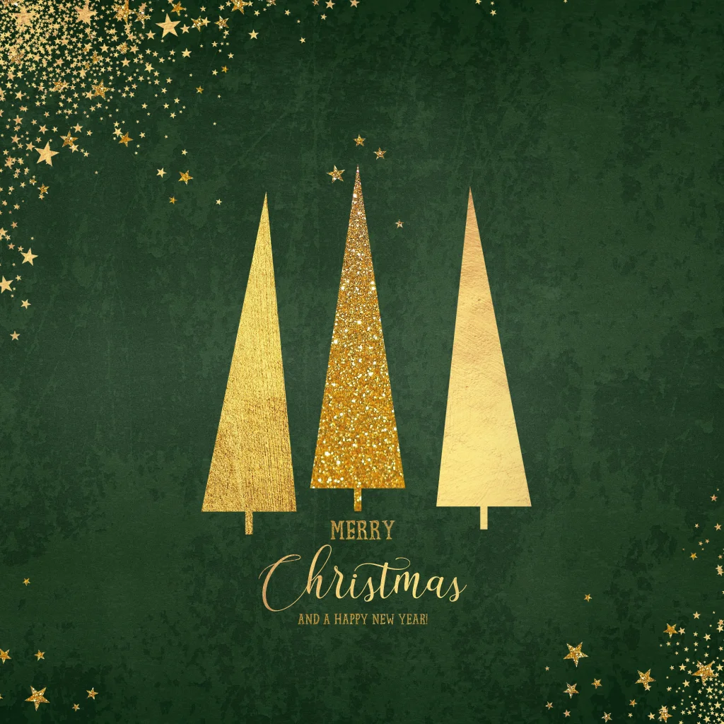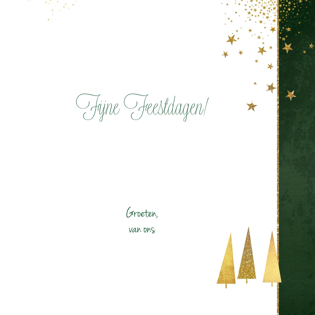 Stijlvolle, klassieke kerstkaart met goudkleurige kerstbomen en sterren op een kerst-groene achtergrond. (geen goudfolie of echte glitters) Je kunt op de voorkant van de kaart je eigen naam toevoegen.