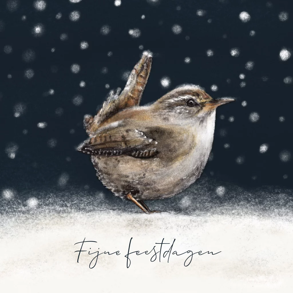 Winterse kerstkaart met een realistische dieren tekening van een schattig winterkoninkje/ vogeltje. Je kunt deze kerstkaart naar wens aanpassen en laten drukken op een papiersoort naar keuze. Verstuur jouw kerstkaart in een mooie envelop en plak deze dicht met een mooie sluitzegel van Heidysign.