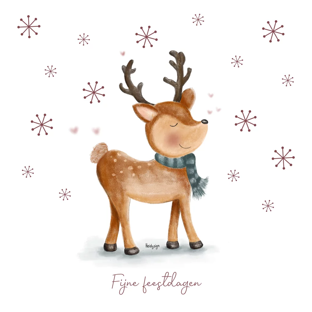 Lieve kerstkaart of nieuwjaarskaart met een winterse tekening van een lief rendier met een lach en abstracte sneeuwvlokken. Je kunt de kaart naar wens aanpassen. Wie maak jij blij met dit lieve kaartje?