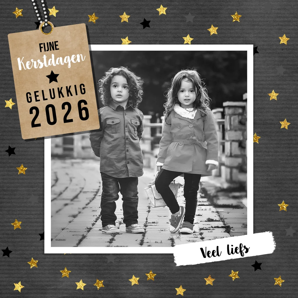 Stoere grijze foto kerstkaart met goudkleurige sterren - 2026