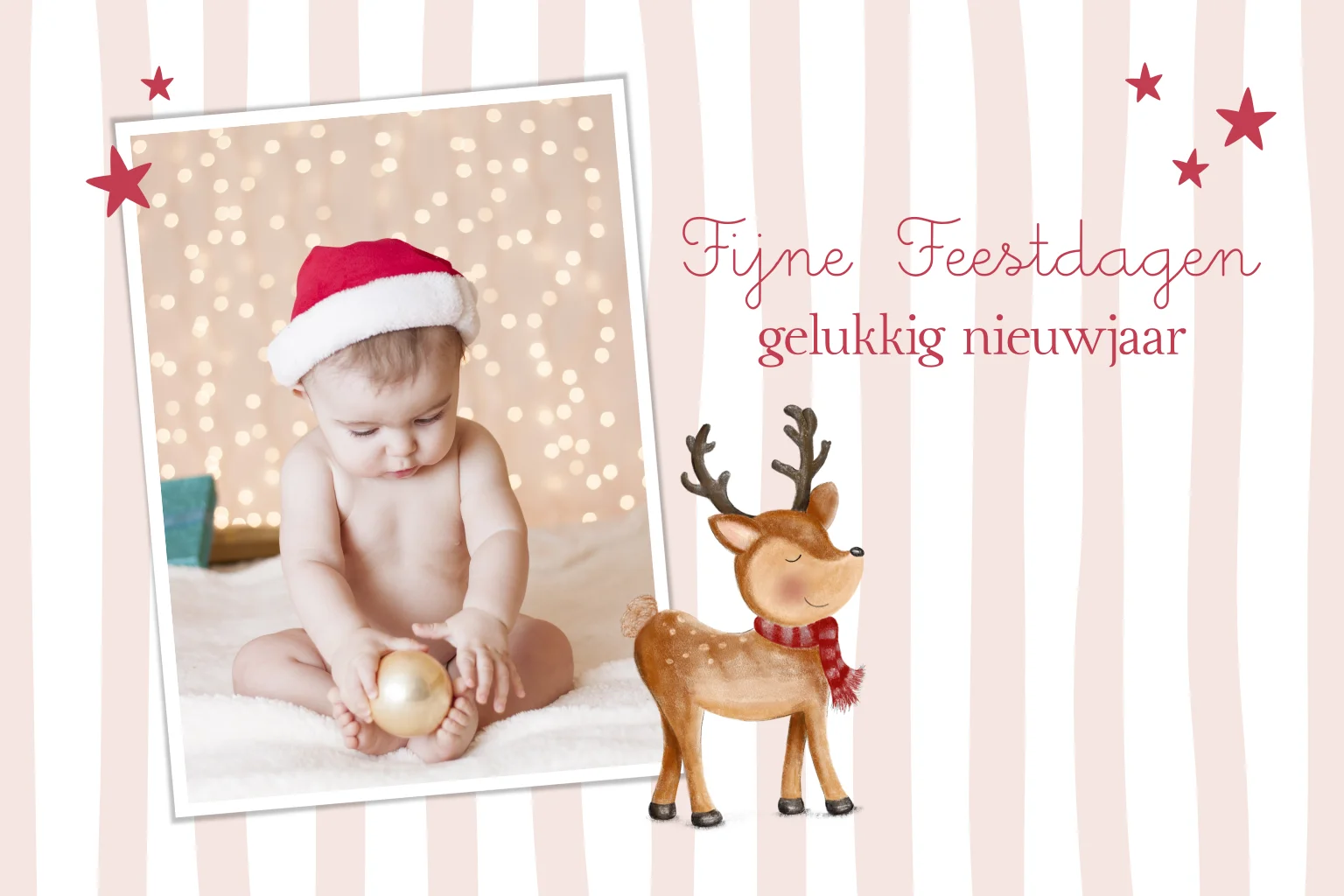 Foto kerstkaart met licht roze strepen en schattig rendier