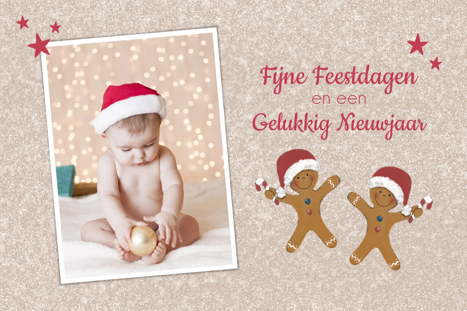 Vier de feestdagen met een speelse en warme touch met deze foto kerstkaart. De zandkleurige achtergrond is versierd met een subtiel sneeuwpatroon en twee vrolijk dansende kerstkoekjes/ gingerbread figuren, die zorgen voor een glimlach bij iedereen die de kaart ontvangt. Voeg eenvoudig je eigen foto toe en pas de tekst naar wens aan om de kaart een persoonlijk tintje te geven. Bestel een proefdruk om te zien hoe jouw unieke creatie eruitziet en maak de feestdagen extra feestelijk met deze charmante en gezellige kerstkaart!