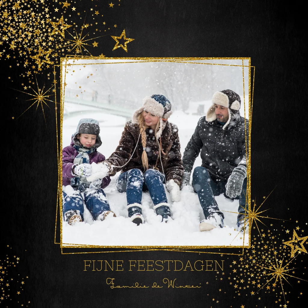 Stijlvolle zwarte foto kerstkaart met goudkleurige sterren