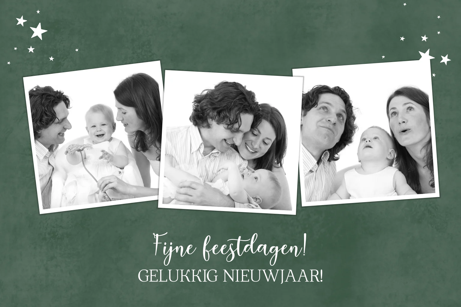 Deze elegante kerstkaart heeft een feestelijke kerst groene achtergrond met een subtiele structuur en afgeronde hoeken voor een zachte, verfijnde uitstraling. De sprankelende sterren en kerstgroet op de voorzijde zijn gedrukt in goudfolie, wat de kaart een luxe accent geeft. Met ruimte voor drie persoonlijke foto's, die je eenvoudig kunt vervangen, is deze kaart ideaal om je eigen unieke kerstwens te creëren.