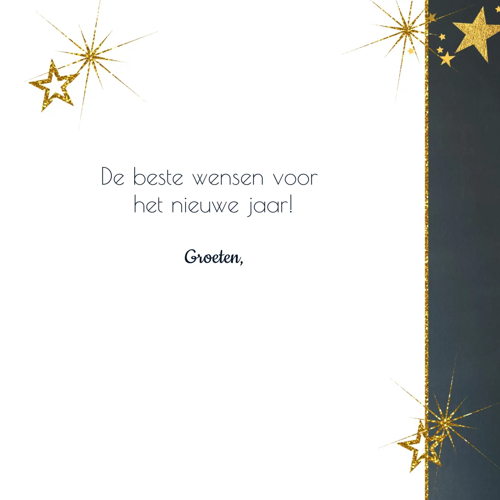 Stijlvolle kerstkaart met een mooie donker blauwe achtergrond, vele goudkleurige sterren en je eigen foto. De foto en teksten zijn gemakkelijk aan te passen. (geen goudinkt of echte glitters)