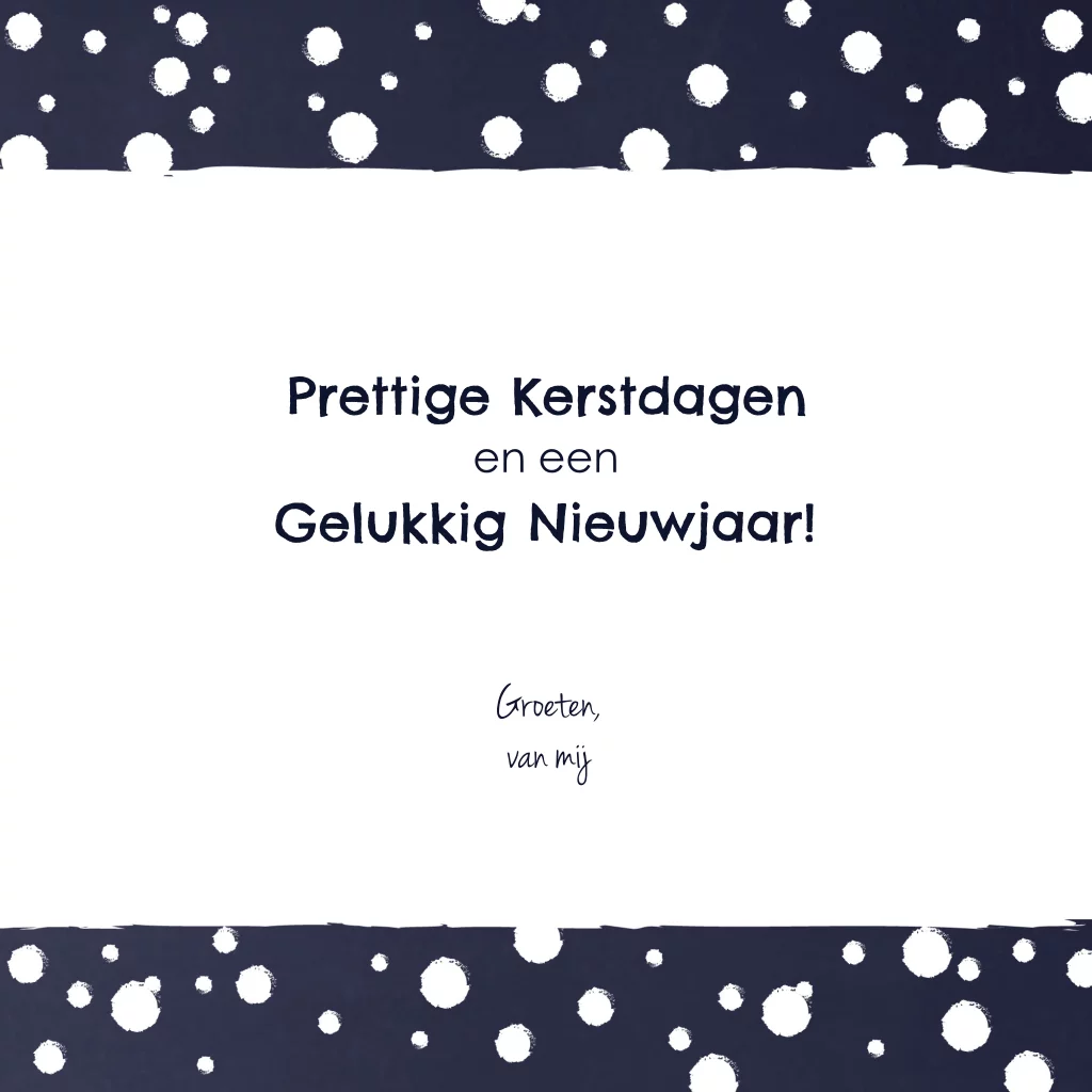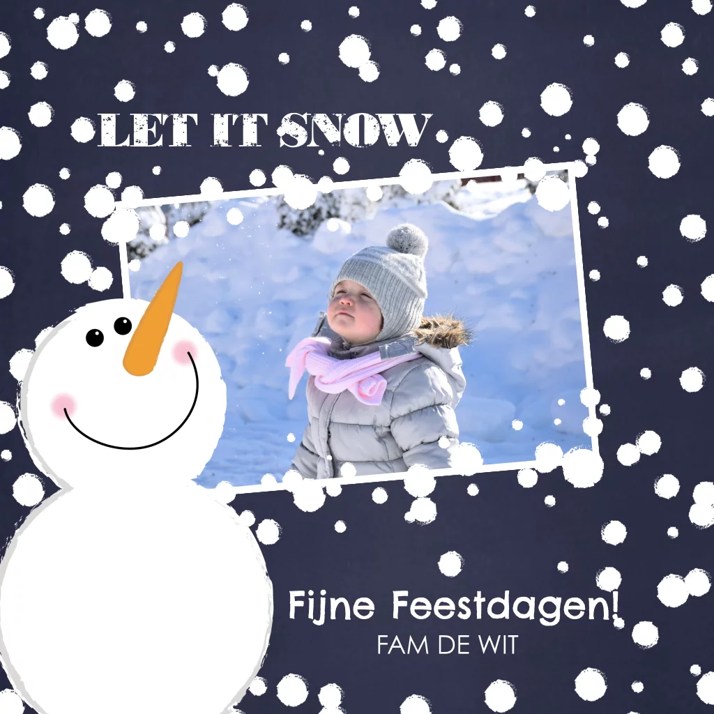 Winterse kerstkaart met een eigen foto en een schattige sneeuwpop met vele sneeuwvlokken. Leuke kaart om naar een kindje te sturen met zijn of haar eigen foto.
