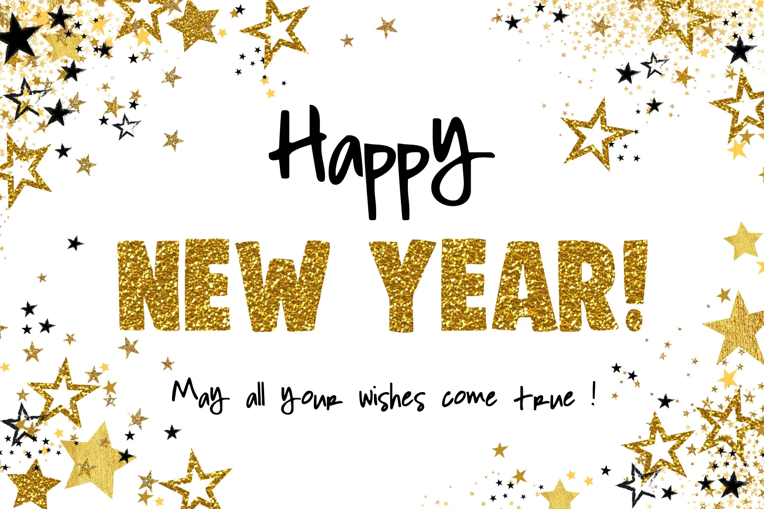 Feestelijke nieuwjaarskaart Happy New Year! Kaart met vele zwarte en goudkleurige glitter sterren. (geen goudfolie of echte glitters)