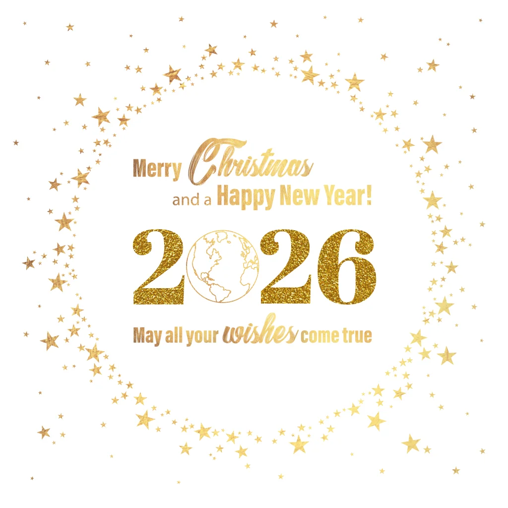 Kerstkaart zakelijke 2026 - stijlvol met gouden sterren wereldbol