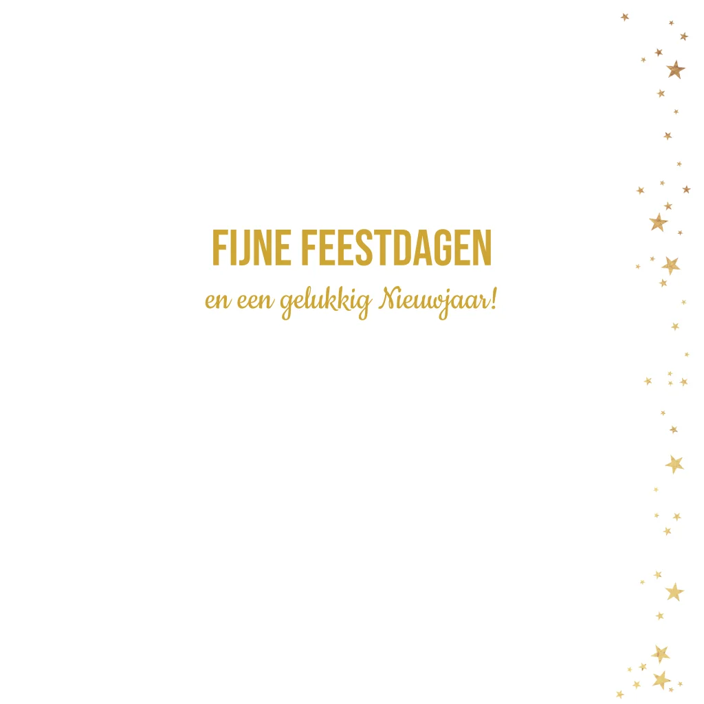 Personaliseer jullie zakelijke kerstgroet met deze exclusieve kerstkaart voor 2026, waarbij een bedrijfsnaam en logo op de kaart kunnen schitteren. Bestel een proefdruk om de verfijnde uitstraling te ervaren, met een stijlvol wit ontwerp, goudkleurige sterren en een sprankelende goudkleurige tekst. Kies uit een selectie van mooie enveloppen om de zakelijke nieuwjaarsgroet een extra vleugje elegantie te geven.