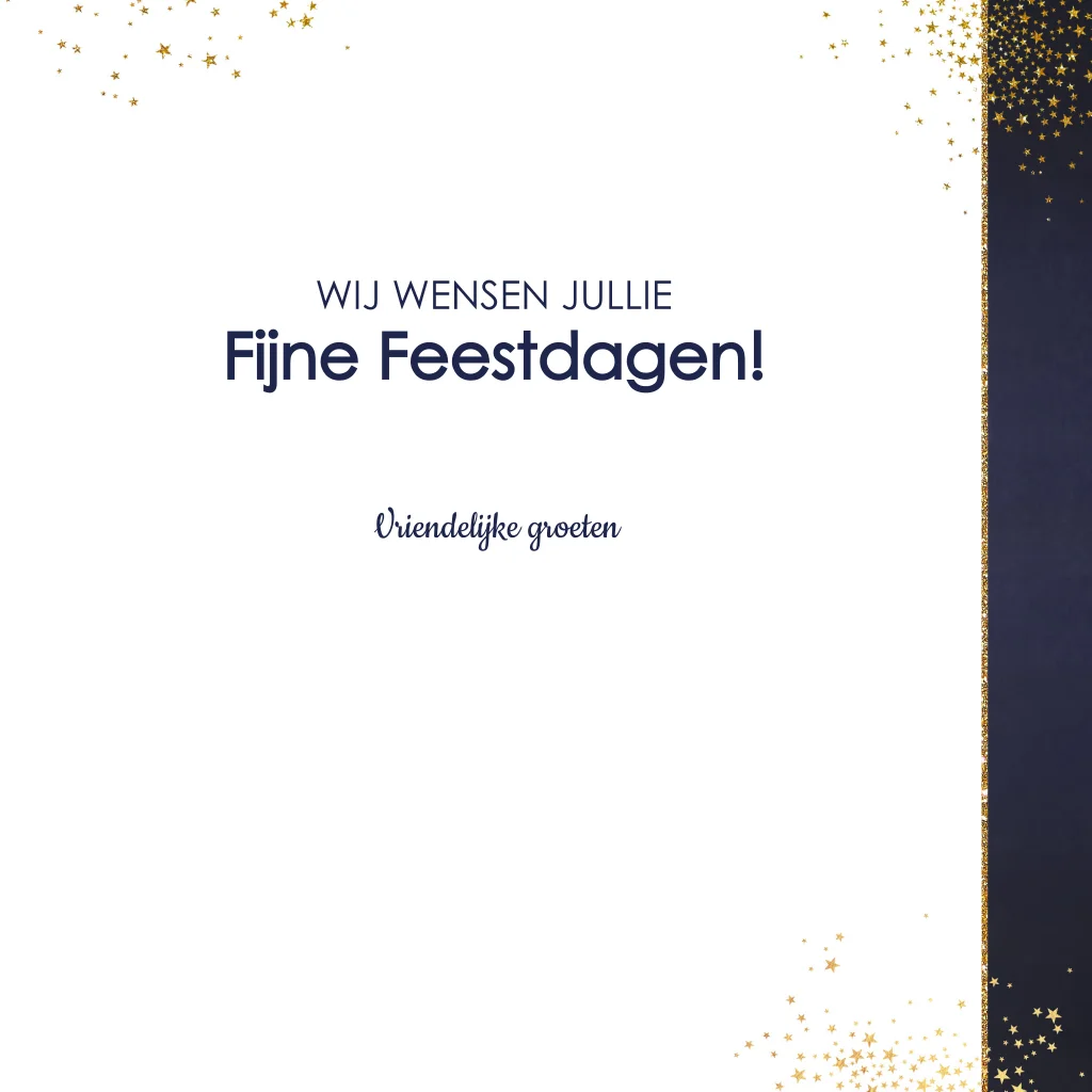 Voeg een persoonlijk tintje toe aan een zakelijke kerstgroet met deze kerstkaart voor 2026, waarbij jullie bedrijfsnaam en logo een prominente plek kunnen krijgen. Bestel een proefdruk voor een voorproefje van de stijlvolle uitstraling, met een diep donkerblauw ontwerp en een glinsterende goudkleurige kerstwens. Personaliseer verder met keuze uit prachtige enveloppen om je zakelijke nieuwjaarsgroet extra elegant te maken.