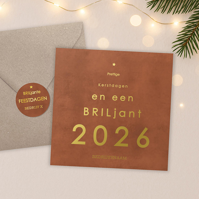 Deze stijlvolle kerstkaart straalt warmte en elegantie uit dankzij de roestbruine gemêleerde achtergrond en de sprankelende goudfolie accenten. De originele kerstgroet met een speelse woordgrap – "We wensen je een BRILjant 2026" – maakt deze kaart perfect voor zakelijke relaties die een glimlach op hun gezicht willen toveren. Deze kaart combineert een professionele uitstraling met een vleugje humor, en biedt ruimte voor een persoonlijke boodschap binnenin.