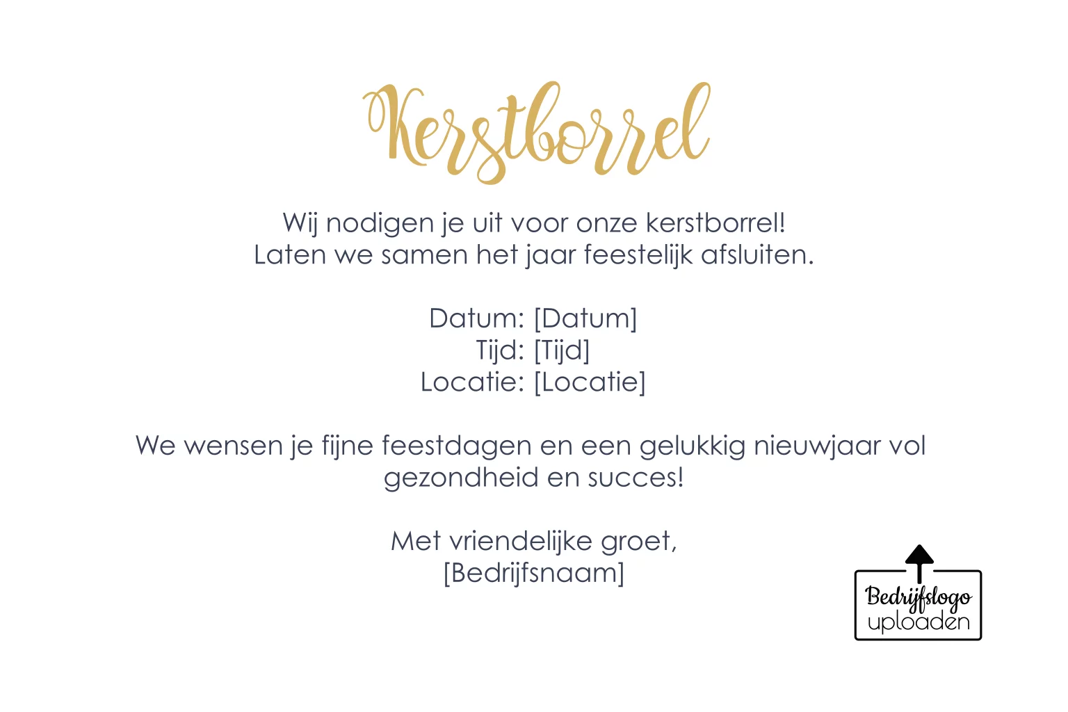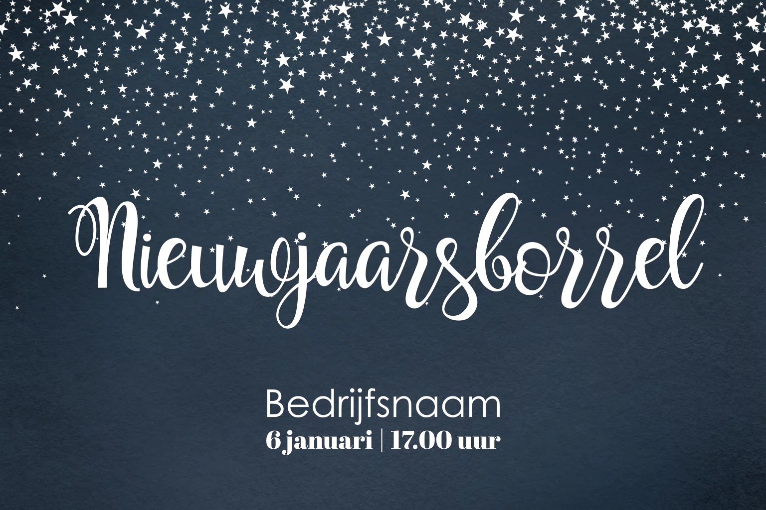 Stijlvolle uitnodiging voor een nieuwjaarsborrel met donkerblauwe achtergrond, gouden folie tekst en een sprankelende regen van gouden sterren straalt luxe en elegantie uit. Pas deze zakelijke uitnodiging eenvoudig aan met jullie bedrijfsnaam en vervang het voorbeeldlogo met een eigen bedrijfslogo. Bestel een proefdruk om het perfecte resultaat te garanderen. Maak de uitnodiging compleet met een mooie envelop en een sluitzegel bedrukt met uw logo.