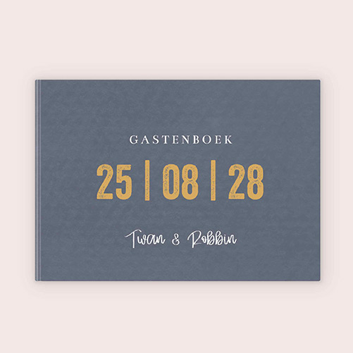 Bekijk hier ons stoere gastenboek met een grijs-blauwe achtergrond met structuur en een krachtige tekst op de cover. Laat jullie bruiloftsgasten hun wensen schrijven op de 72 pagina’s van dit unieke boek. Elk blanco blad wacht op de woorden van jullie familie en vrienden.