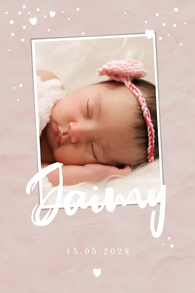 Ontdek ons hippe oud-roze geboortekaartje met een foto van jullie kindje en een schitterende rosé-goudfolie bedrukking. Dit lieve kaartje is versierd met sterretjes en hartjes, en heeft een stoere papierstructuur met een stijlvolle oud-roze achtergrond. Het ontwerp heeft ronde hoeken en is perfect voor de geboorte van een meisje. Je kunt de kaart geheel naar wens aanpassen. Bestel een proefdruk om de kwaliteit zelf te ervaren en maak de aankondiging van jullie kleintje onvergetelijk.