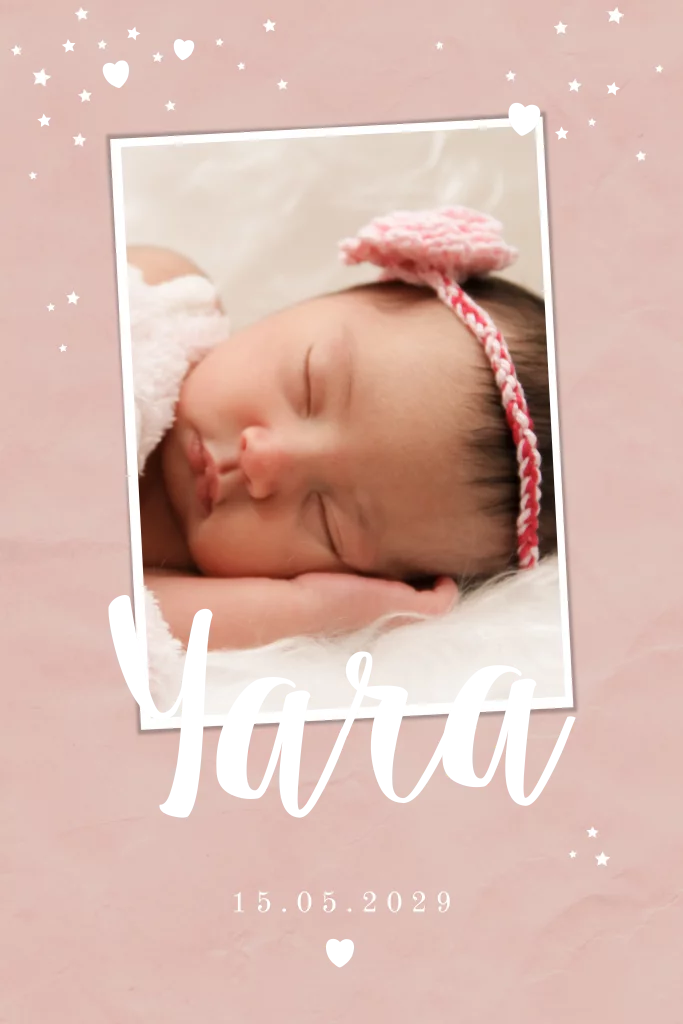 Dit hippe geboortekaartje in oud-roze heeft een stoere achtergrond met een subtiele structuur en een foto van jullie kindje. Het ontwerp is versierd met rosé-goudfolie, witte sterretjes en hartjes. Pas de kaart eenvoudig naar wens aan en bestel een proefdruk om de kwaliteit zelf te ervaren. Maak de aankondiging van jullie kleintje extra bijzonder met dit charmante en stijlvolle kaartje.