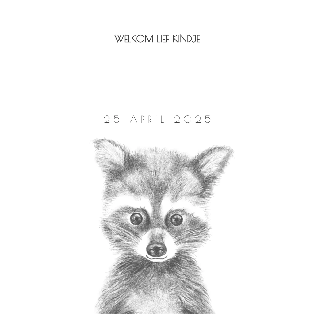 Geboortekaart potloodtekening schattig wasbeertje en goudfolie Noah