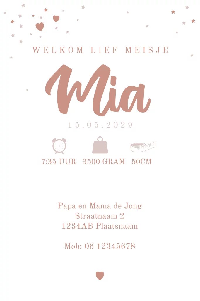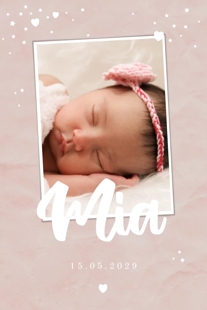Maak hier een hippe oud-roze geboortekaartje voor een meisje met een foto van jullie kindje en prachtige rosé-goudfolie accenten. Dit charmante kaartje is versierd met schattige sterretjes en hartjes, en heeft een stoere papierstructuur met een stijlvolle oud-roze achtergrond. Pas het ontwerp eenvoudig aan naar jullie wensen en maak het uniek. Een proefdruk bestellen is mogelijk, zodat je de kwaliteit zelf kunt ervaren.