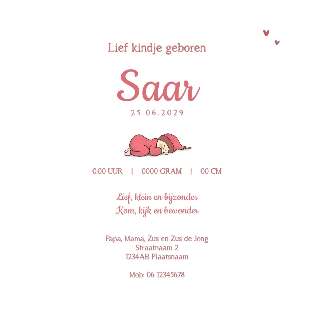 Dit geboortekaartje is helemaal naar wens aan te passen. Kies zelf de namen en datum in het elegante lettertype en pas de gezinssamenstelling aan met kindjes uit de beeldbank. Zo maak je het kaartje helemaal persoonlijk. Wil je eerst de kwaliteit ervaren? Bestel dan een proefdruk vanaf €1,- en bewonder het ontwerp in het echt.