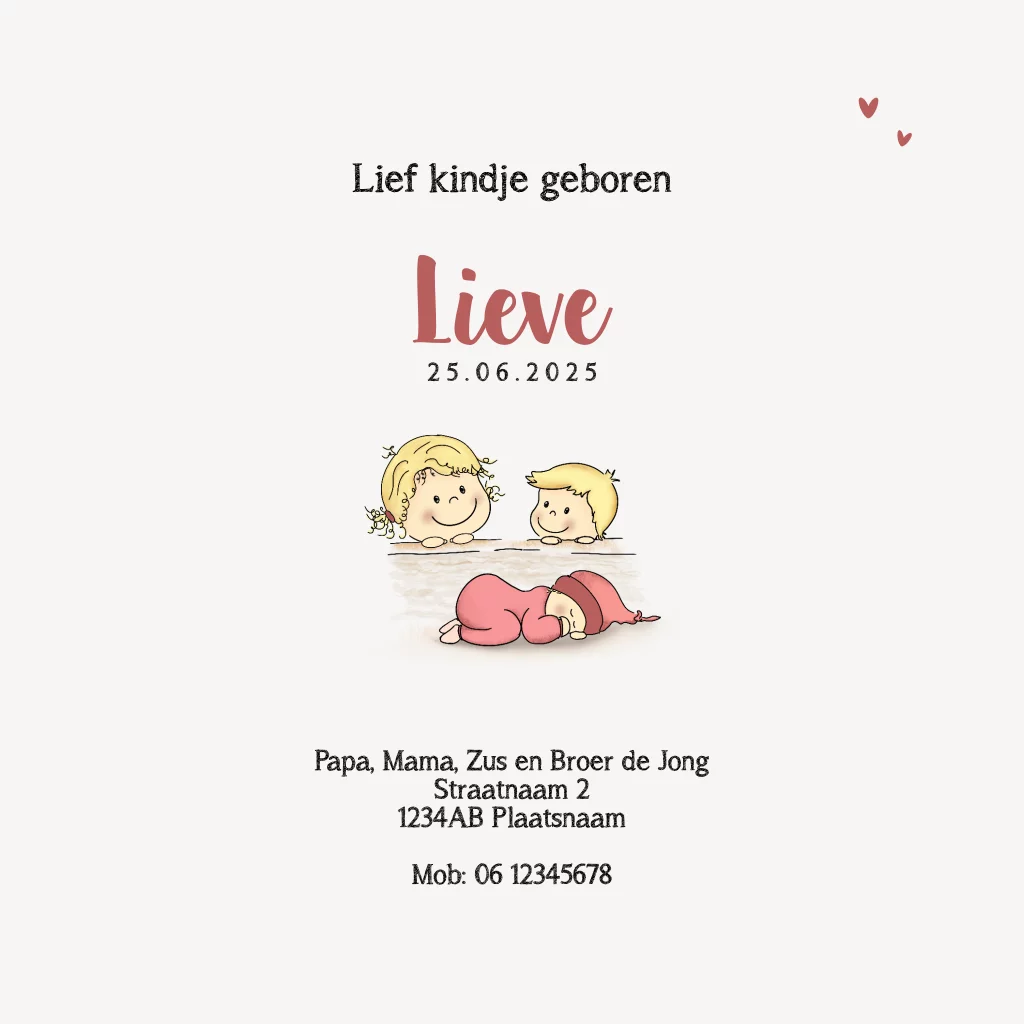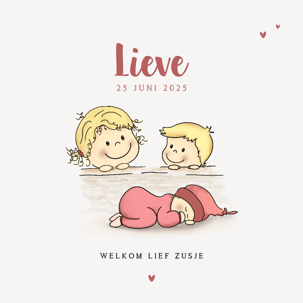 Geboortekaartje meisje derde kindje tekening zus en broer met baby