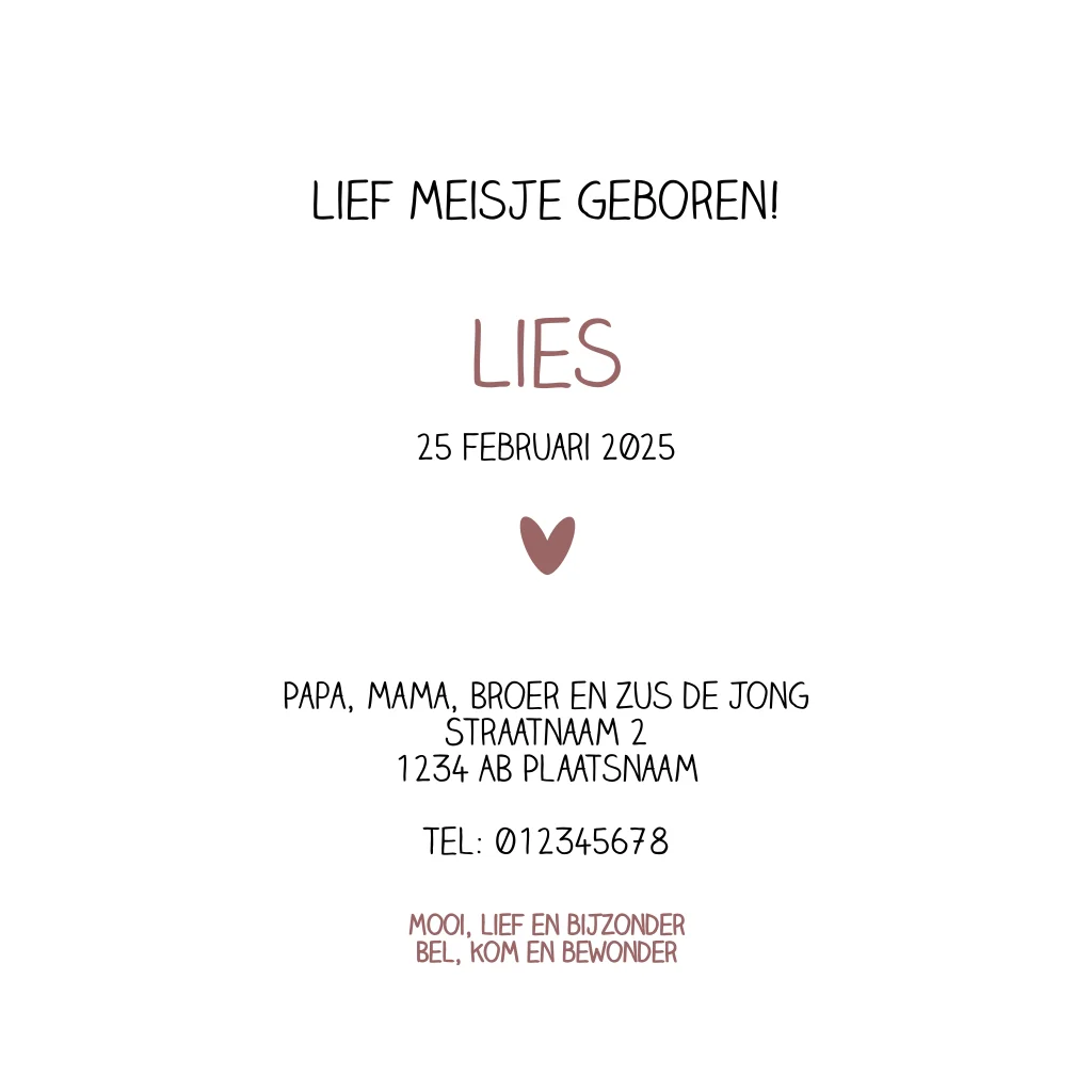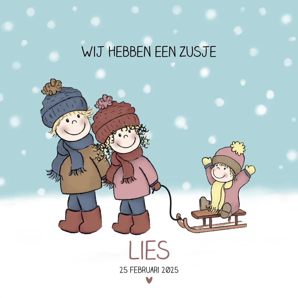 Verwachten jullie een derde kindje? Dan is dit schattige, winterse geboortekaartje misschien wel iets voor jullie. Dit geboortekaartje heeft een tekening met een babymeisje op een slee in de sneeuw dat wordt voortgetrokken door haar grote broer en zus. Je kunt deze geboortekaart naar wens aanpassen, zo weet je zeker dat jullie een unieke geboortekaart voor jullie dochter hebben.