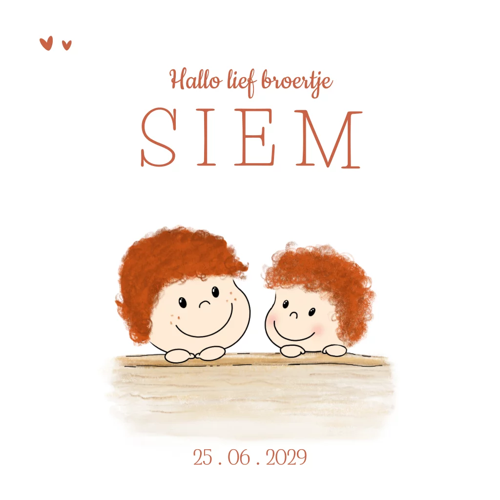 Schattig geboortekaartje voor een tweede kindje met een tekening van twee vrolijke, ondeugende jongetjes met rode krullen, waarvan de één de grote broer is. Pas dit geboortekaartje naar wens aan en bestel een proefdruk om te kijken of deze naar wens is. Je kunt de gezinssamenstelling helemaal naar wens aanpassen met de collectie tekeningen van schattige kindjes in de editor.
