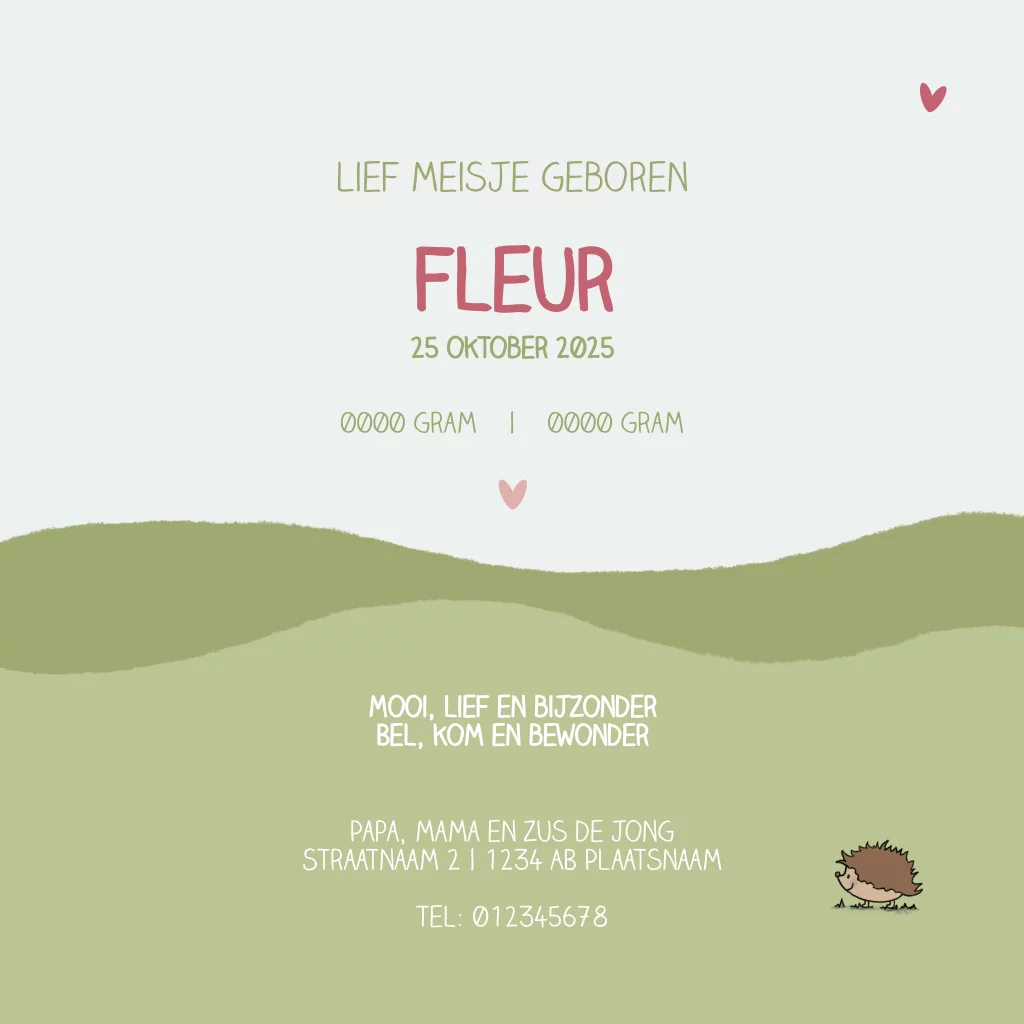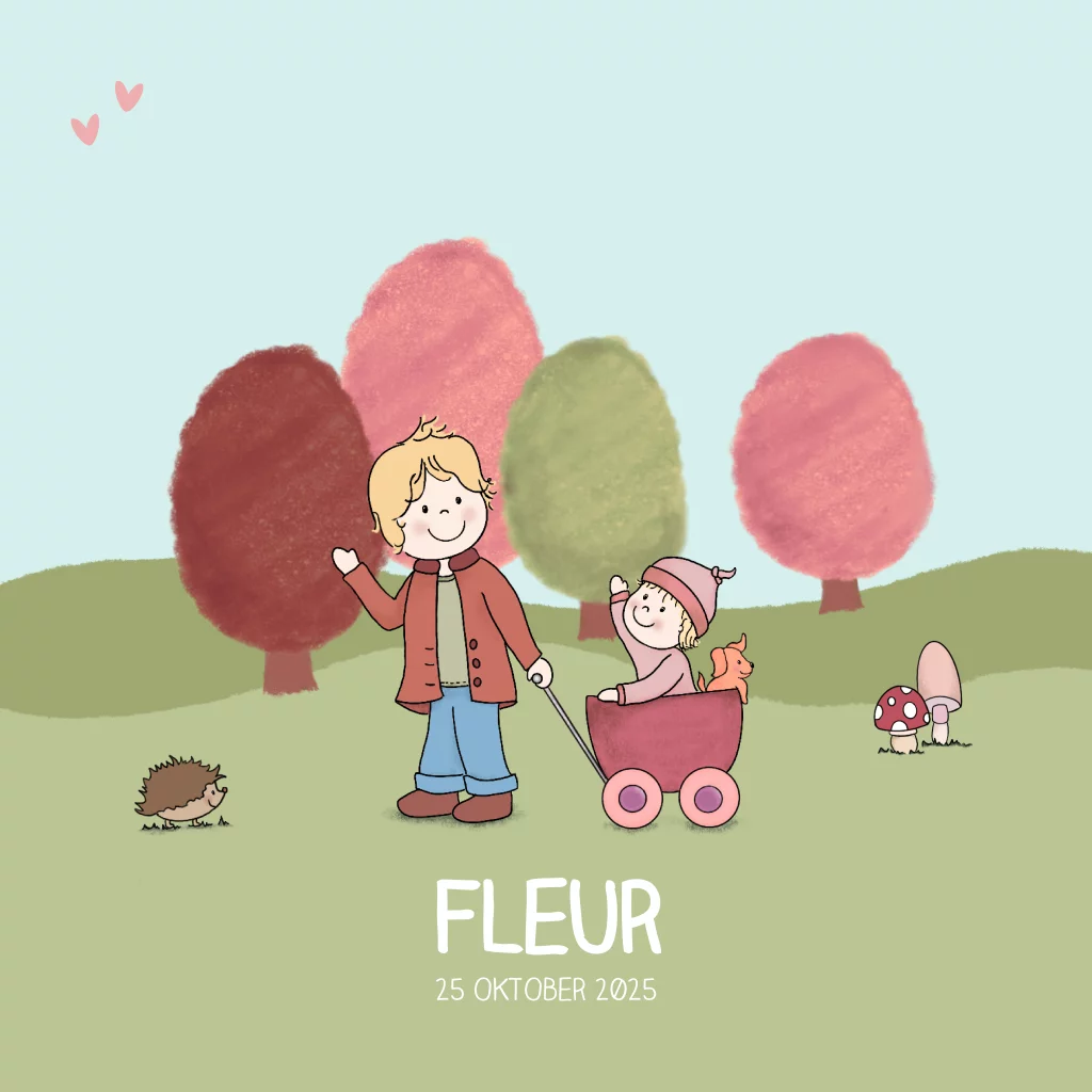 Vier de komst van jullie tweede kindje met ons prachtige geboortekaartje! Op de voorkant zie je een hartverwarmende tekening van een grote broer die zijn kleine zusje in een bolderkar voorttrekt, te midden van een kleurrijk herfstlandschap. Klein egeltje, paddenstoelen en bomen gehuld in warme herfsttinten maken deze kaart extra speciaal.