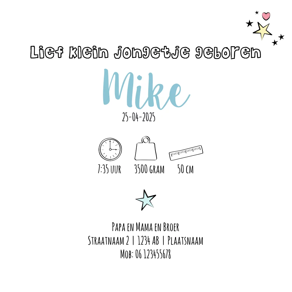Hip geboortekaartje broertje kraft met illustratie kindjes Mike