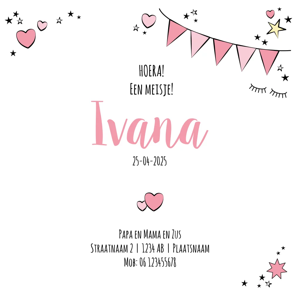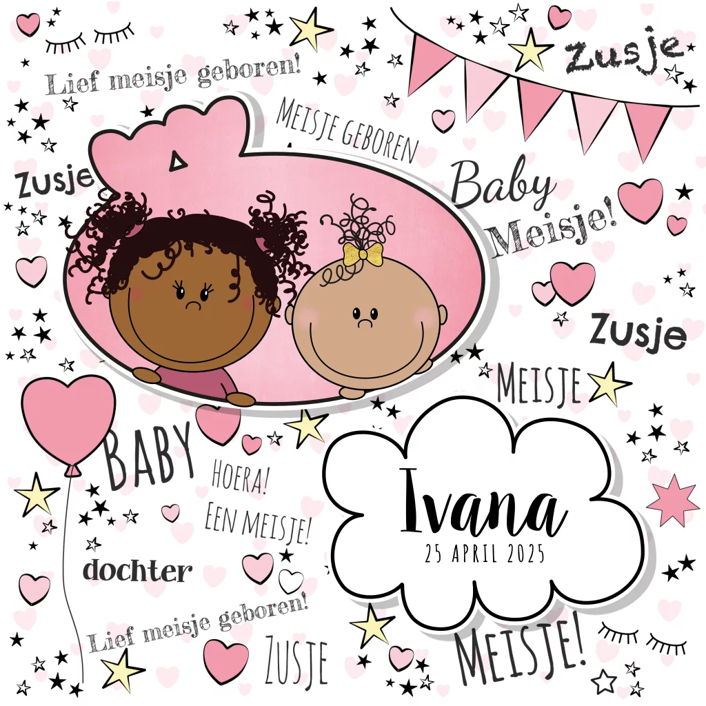 Hip geboortekaartje in handletteringstijl voor zusje met een illustratie van 2 zussen. Deze illustratie kan gemakkelijk worden vervangen tijdens het bewerken van je kaartje. Er staan meerdere plaatjes voor je klaar van broertjes en zusjes waaruit je zelf kunt kiezen.