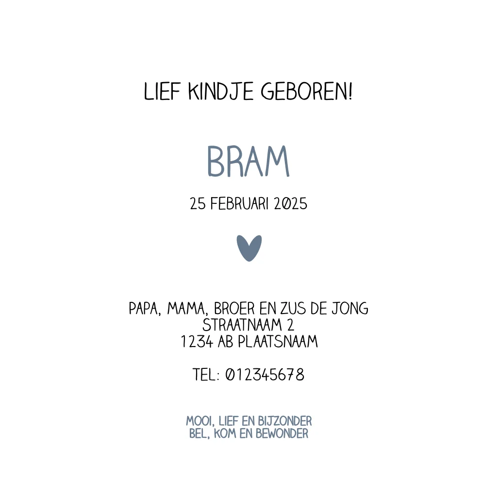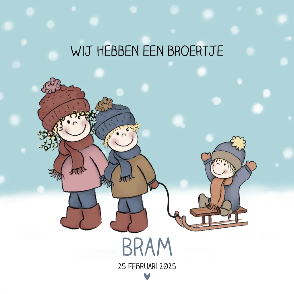 Wanneer jullie een derde kindje verwachten, is dit geboortekaartje misschien wel iets voor jullie zoon. Dit kaartje heeft een tekening met een babyjongen op een slee in de sneeuw, die wordt voortgetrokken door zijn grote broer en zus. Je kunt deze geboortekaart naar wens aanpassen, zodat je zeker weet dat je een unieke geboortekaart voor jullie zoon hebt.