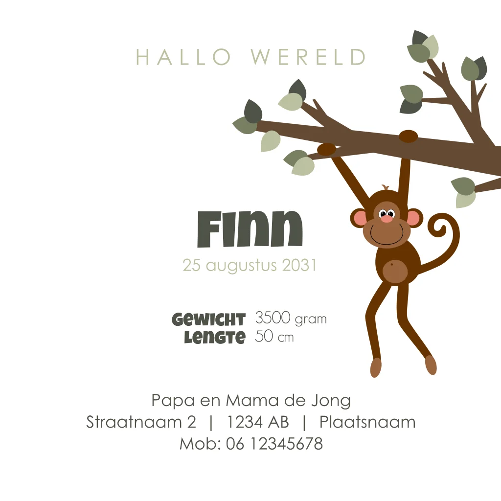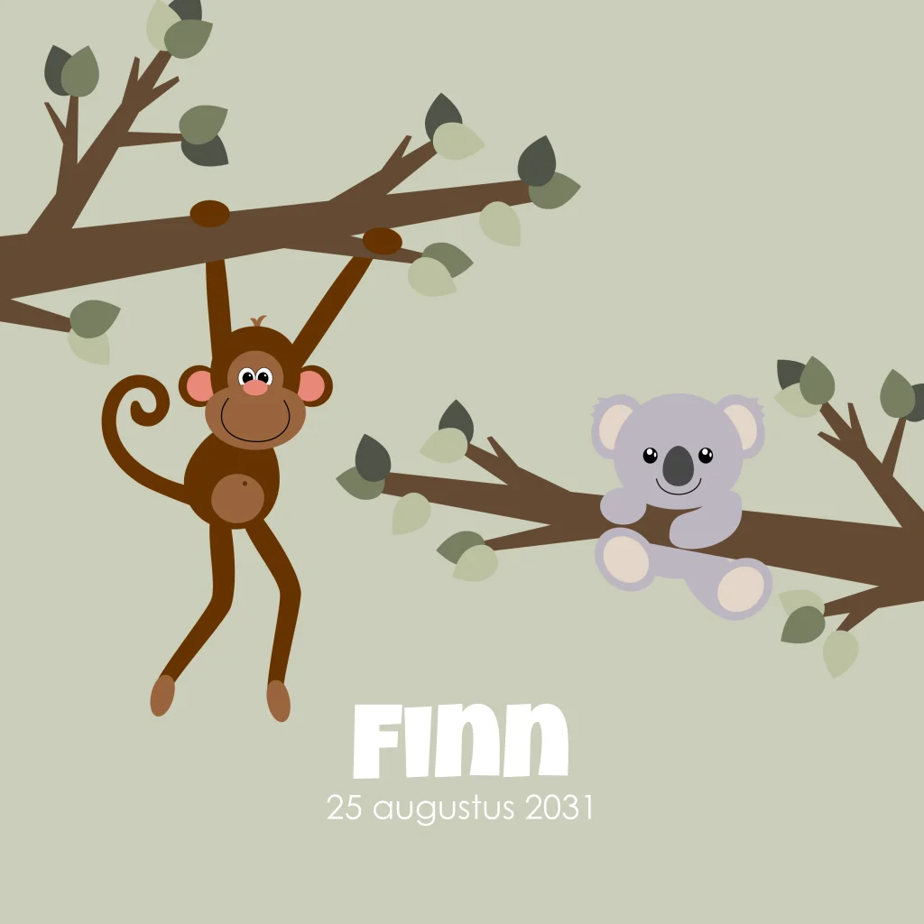 Schattige groene geboortekaart voor een jongen. Deze geboortekaart heef een illustratie van een aapje en een koalabeer hangend aan een tak met blaadjes. Je kunt de kaart gemakkelijk aanpassen en er je eigen unieke geboortekaart van maken. De achtergond-kleur kan worden aangepast.