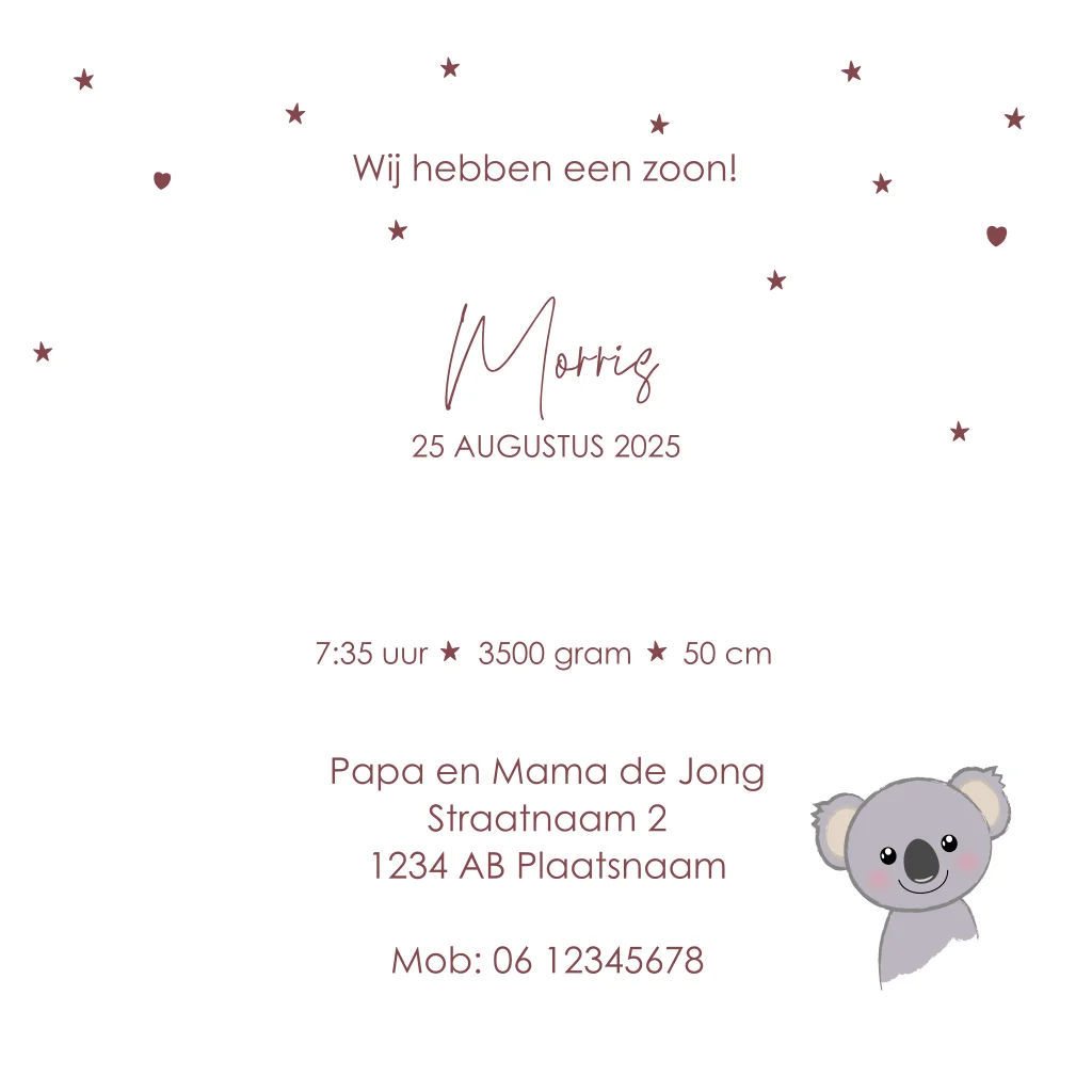 Hip geboortekaartje voor een jongen of meisje. Schattige geboortekaart met sterretjes en hartjes en een illustratie van een lief koalabeertje.