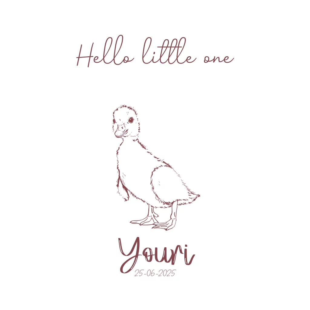 Lief dieren geboortekaartje met een pentekening van een schattig baby eendje. Pas dit geboortekaartje geheel naar wens aan en bestel een proefdruk om de geboortekaart in het echt te kunnen bewonderen. Je kunt bij deze kaart ook de kleur van het eendje nog naar wens aanpassen. Super leuk, zo is het geboortekaartje voor jouw kindje echt een unieke kaart.