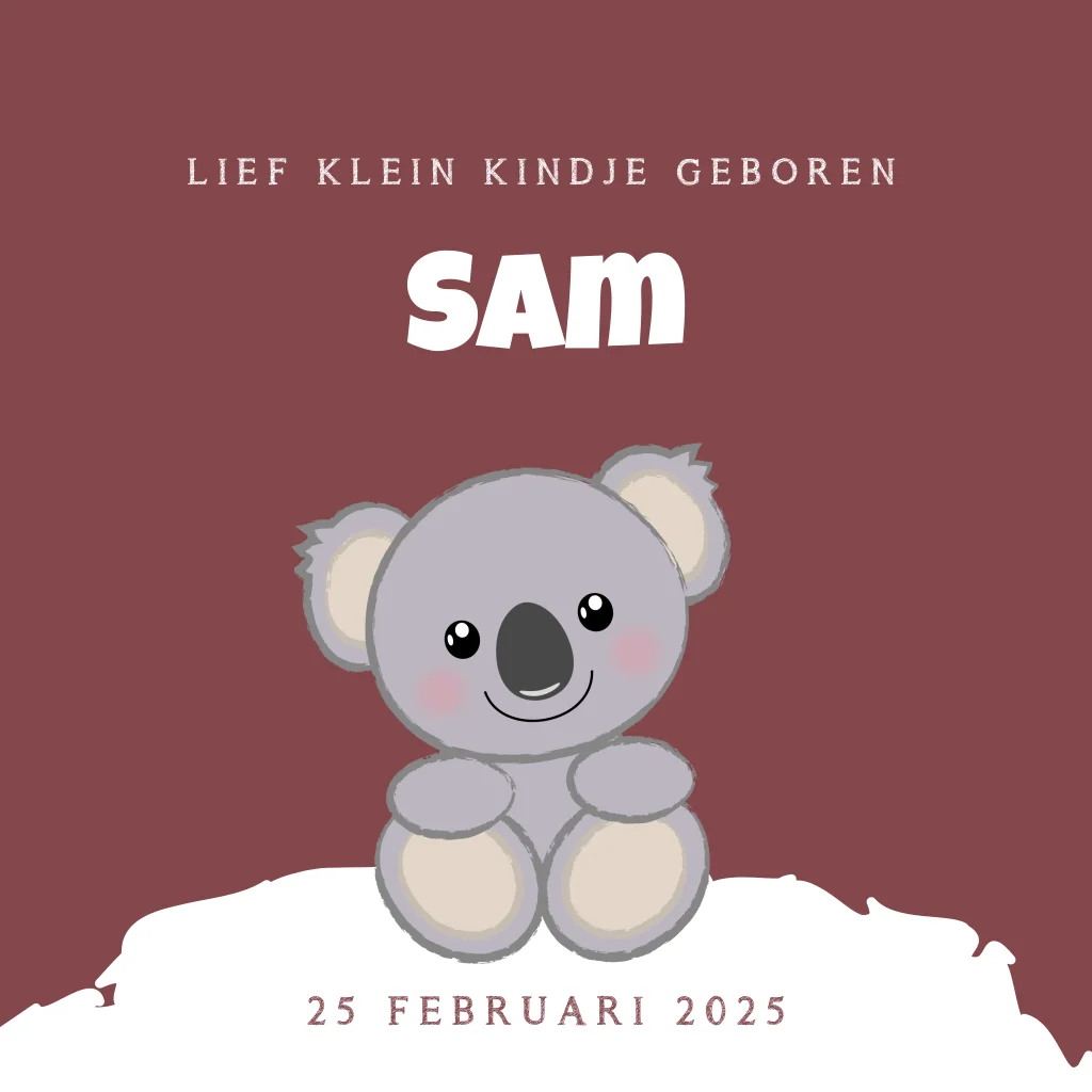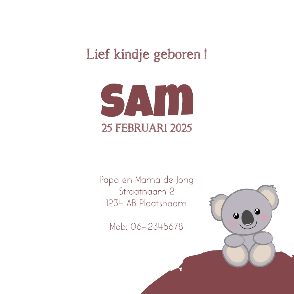 Geboortekaartje. Winterse kaart met een illustratie van een lief koalabeertje. Deze kaart is eenvoudig aan te passen.