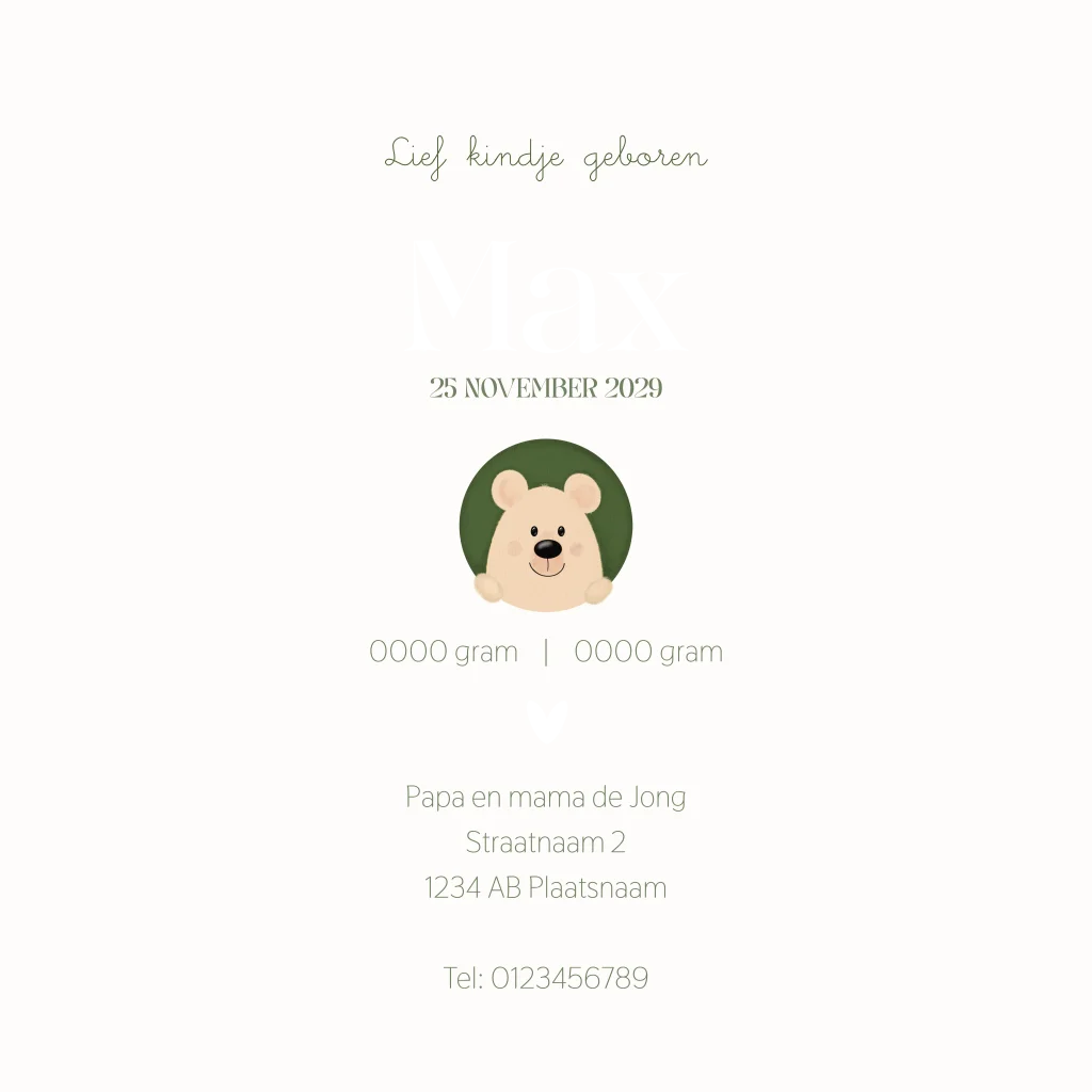 Dit stoere én lieve geboortekaartje met groene stippen en een schattige beer is perfect voor jullie kleintje. De naam staat in luxe goudfolie gedrukt en springt prachtig uit tegen de groene achtergrond.
