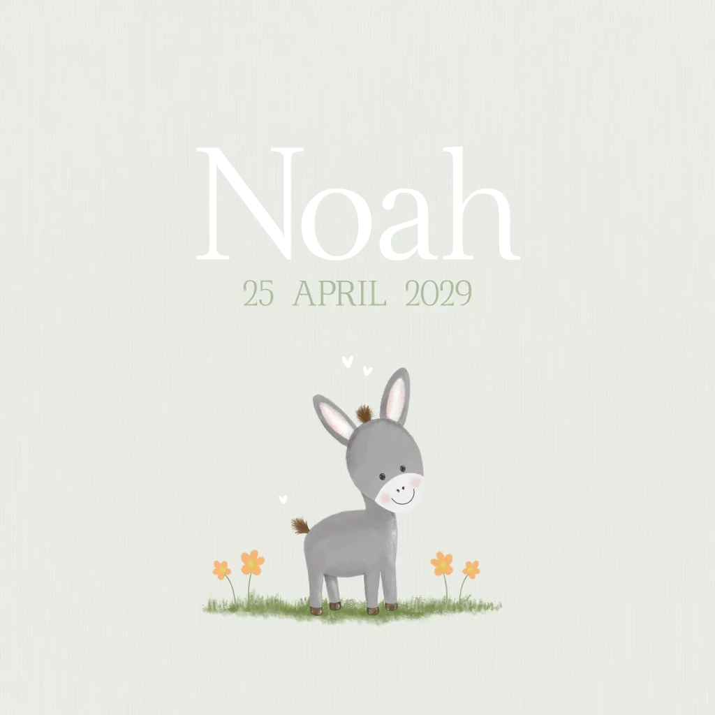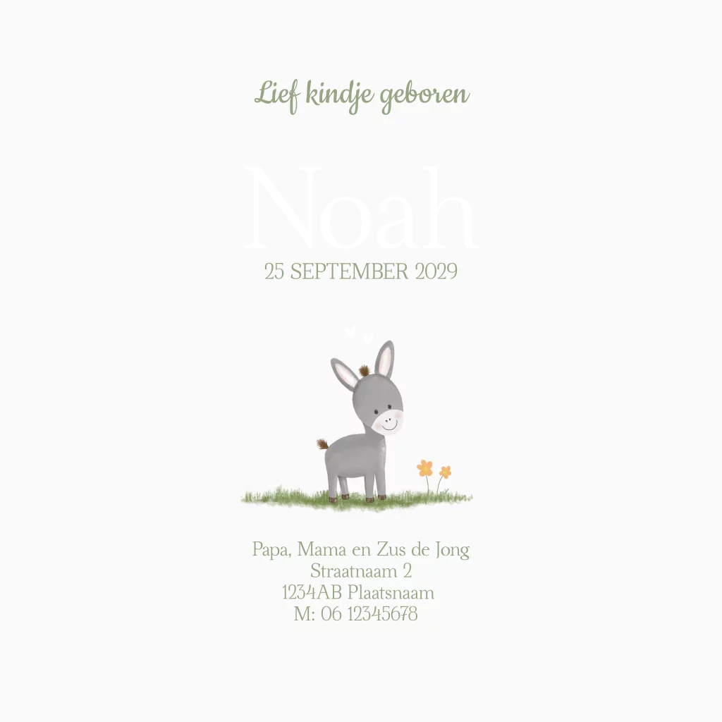 Laat iederen weten dat jullie kindje is geboren met dit lieve geboortekaartje met een vrolijk ezeltje in de hoofdrol.