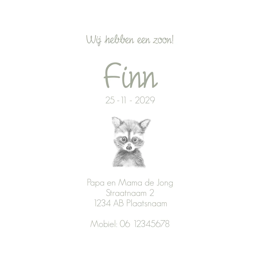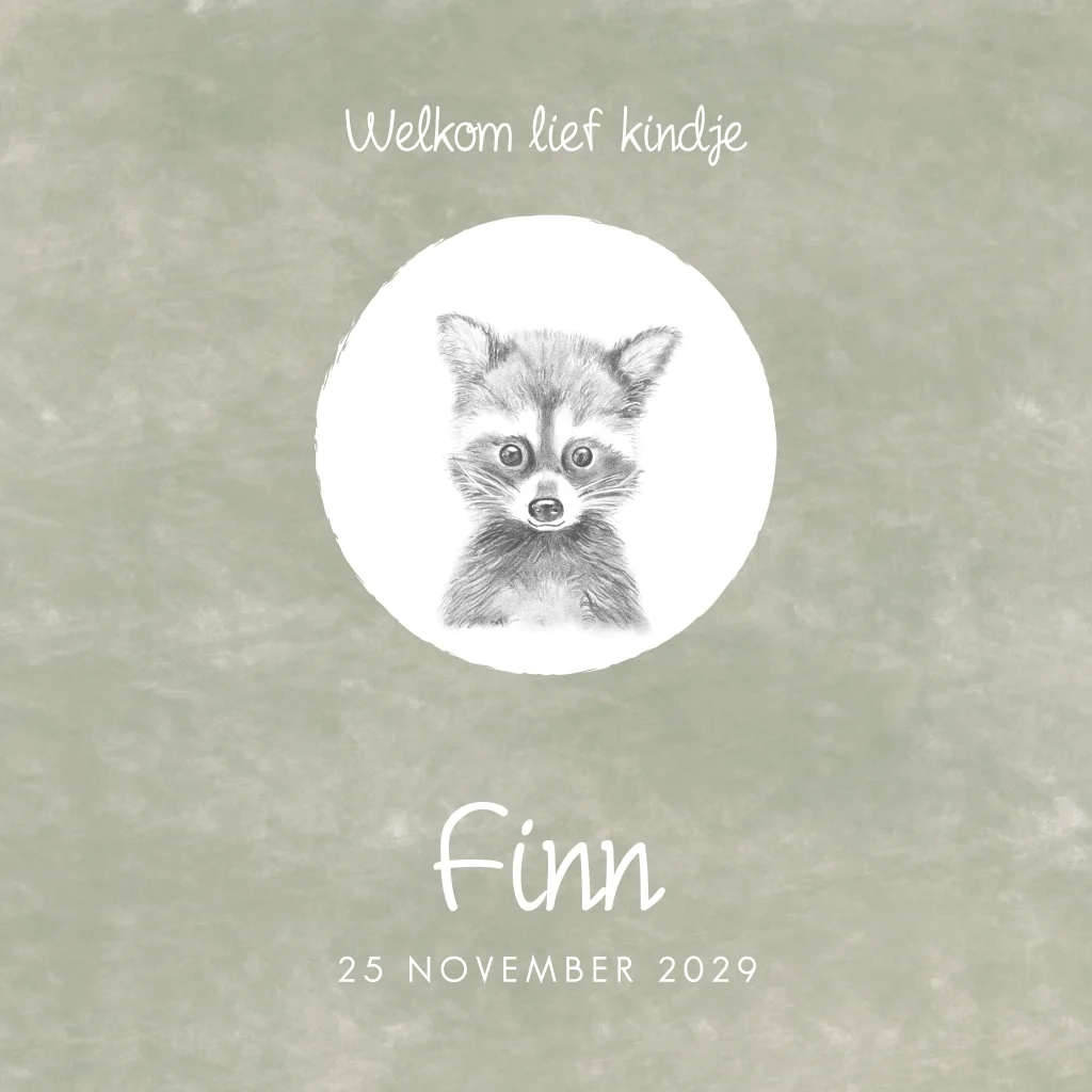 Stijlvol geboortekaartje met een gemêleerde groene achtergrond en een realistische potlood tekening van een lief wasbeertje met schattige oogjes. Pas deze dieren geboortekaart naar wens aan en maak er een unieke geboortekaart van voor jullie kindje.
