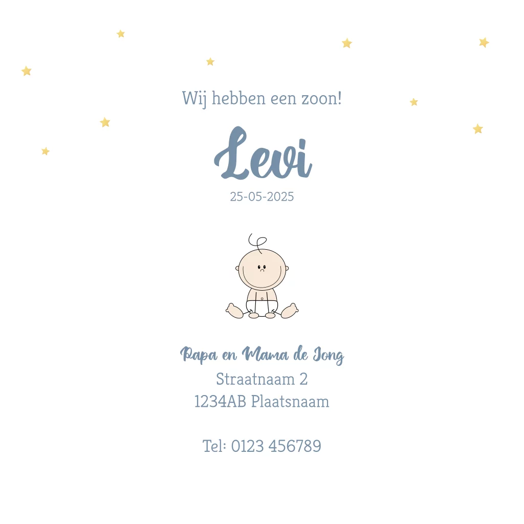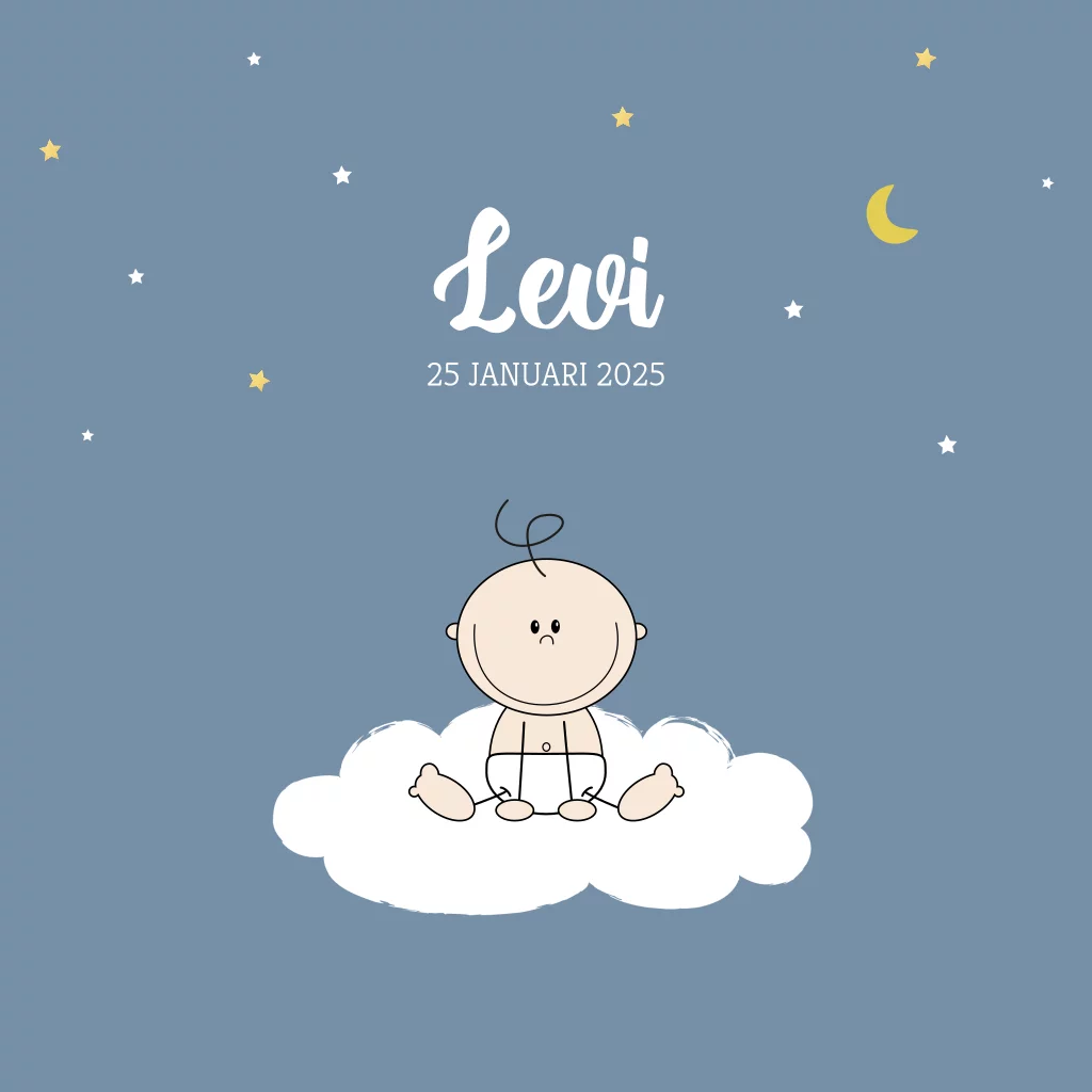 Geboortekaartje voor een jongen. Grappig, blauw geboortekaartje met een illustratie van een schattige baby op een wolkje tussen de sterretjes een een maantje. Je kunt deze geboortekaart eenvoudig naar wens aanpassen en er jullie unieke geboortekaart van maken.